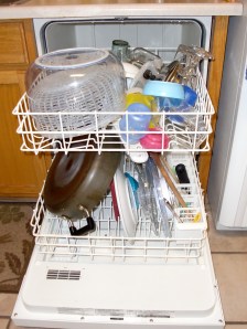 For at least the past couple of weeks, the dishwasher’s been making funny noises and just generally acting oddly. The dishes in the top rack weren’t really getting very clean, but we operated under the assumption that, since they had run through the dishwasher, they were getting washed. When the dishwasher was finished, we’d put the dishes away and then use them again. After the repairman explained today that the sounds we were hearing indicated that the pump was not getting water to the top rack, we decided that we could no longer pretend that the dishes were getting clean. So, while we shop for a new dishwasher, we are doing the dishes by hand and using the dishwasher as a drying rack. By which, of course, I mean that I am doing dishes by hand and using the dishwasher as a drying rack.
