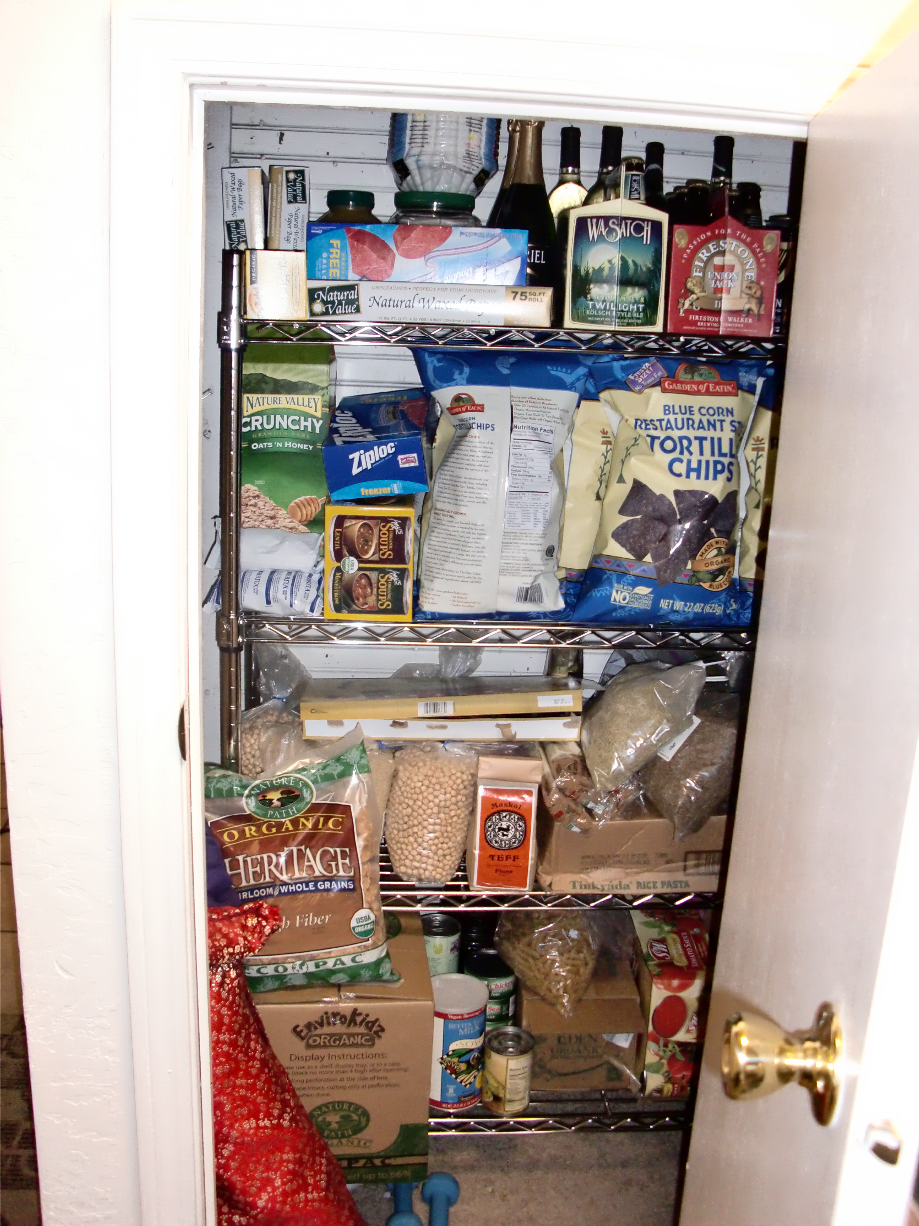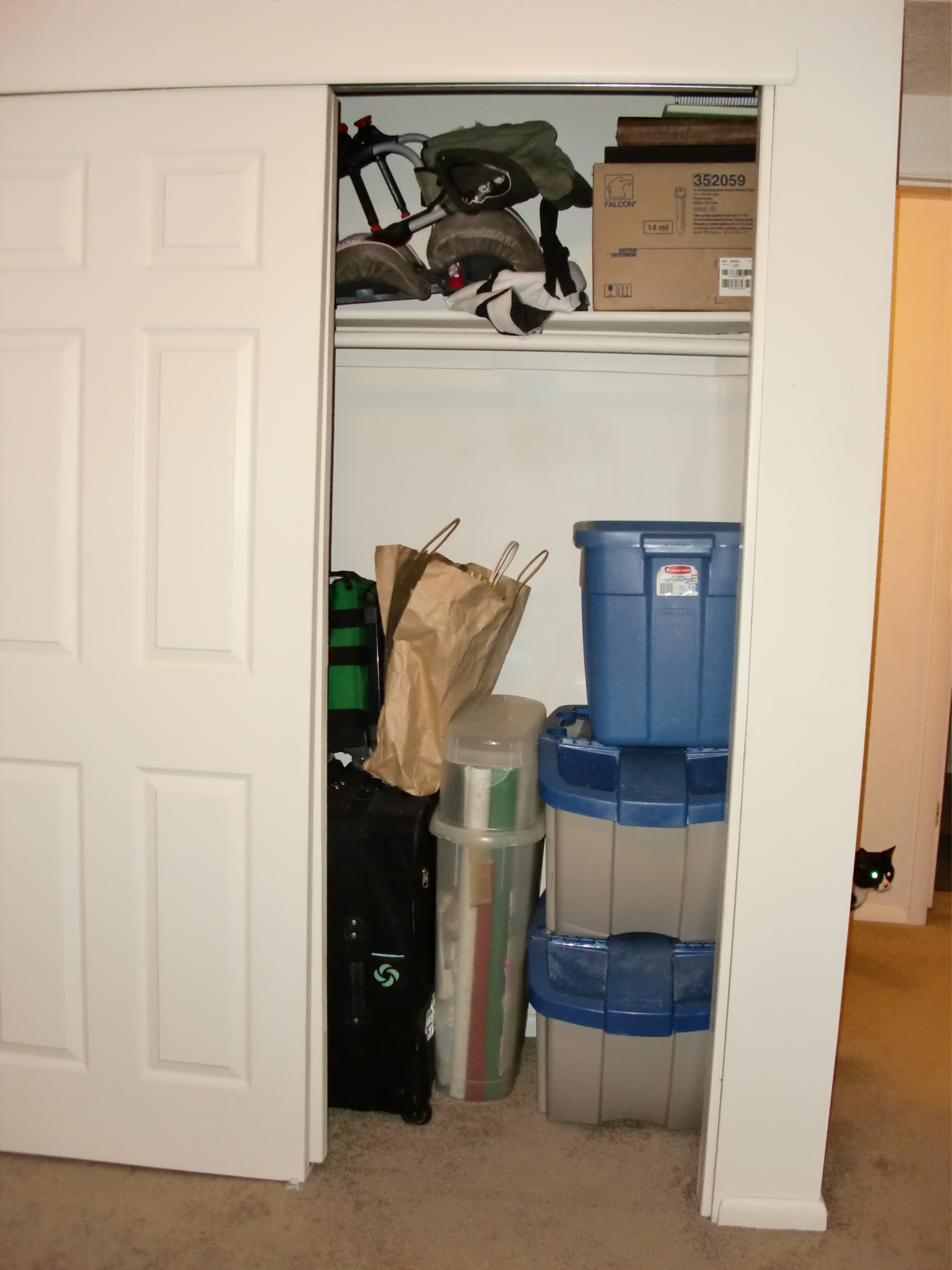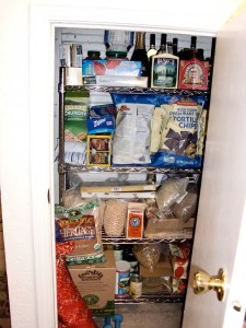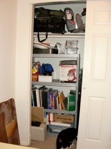 If you sent us a card for our wedding, sorry but it’s now in the recycling. (Well, I kept a couple of personal notes, but the cards that were just signed are outta here.) And what you don’t see is that there used to be a ridiculous set of white plastic shelves just inside our office door that served as our pantry. I managed to get rid of enough stuff that I was able to fit all of the items from those shelves into either the kitchen cupboards or that under-the-stairs closet, which might explode next time we go to Costco. The shelves are now in the upstairs bathroom waiting for the extra toilet paper and tissues that are currently stored in my clothes closet.