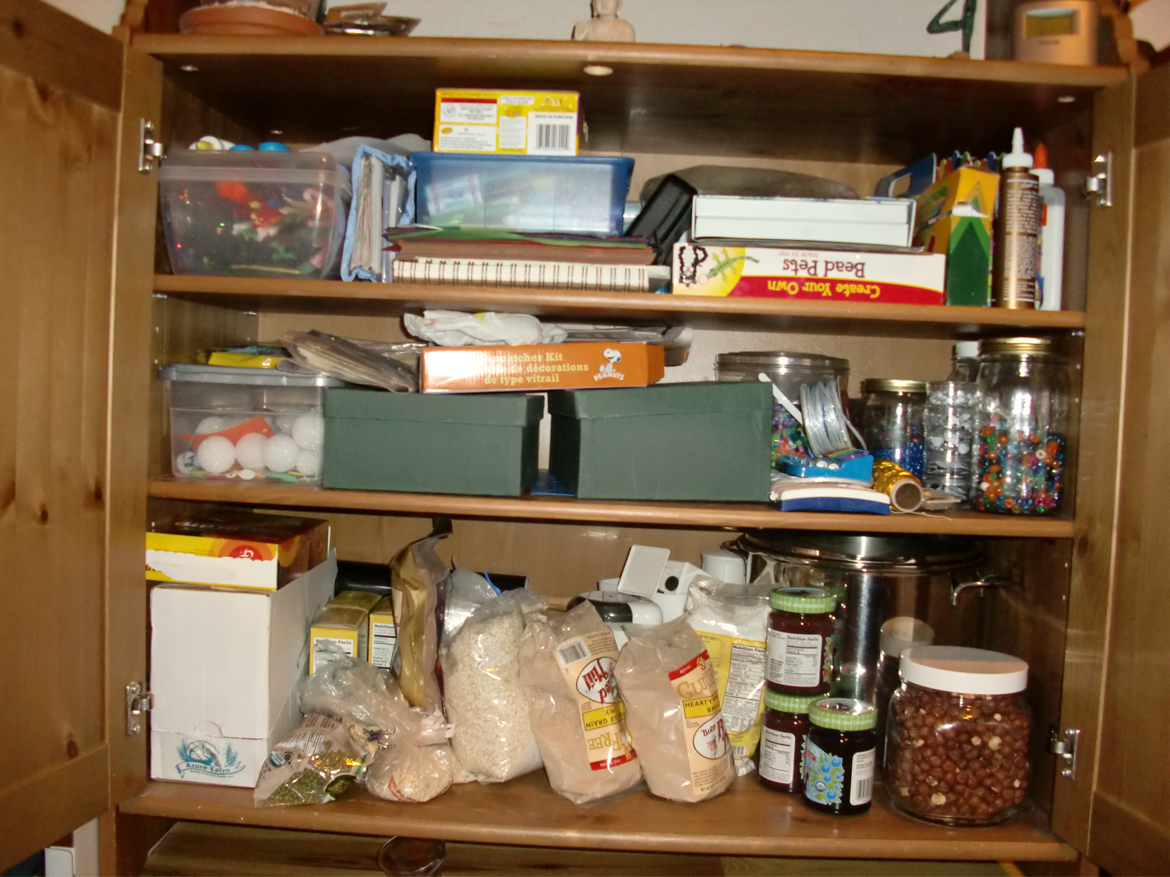 The bottom shelf still holds food items, but the upper two shelves are all crafts.