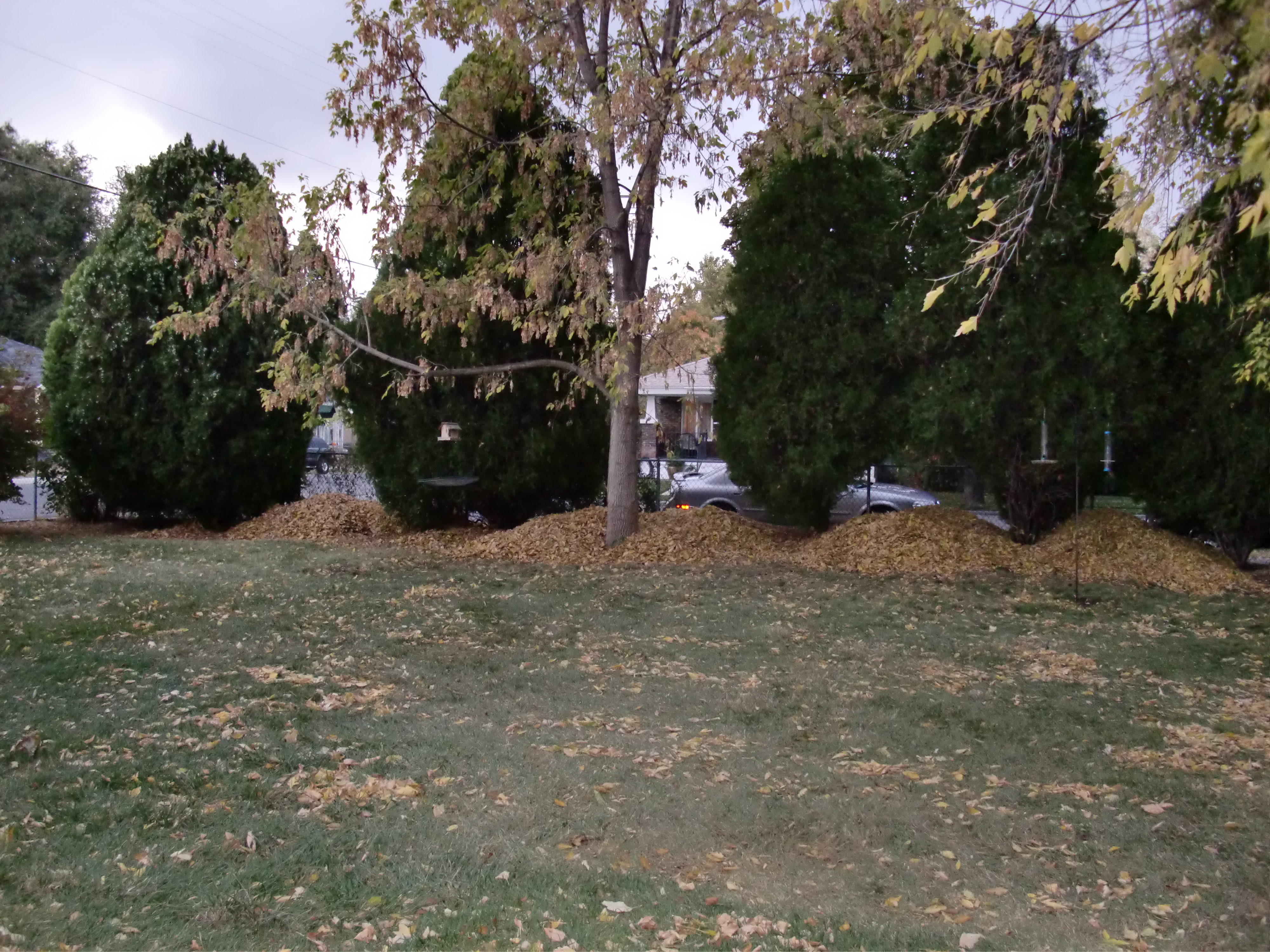 While the potatoes simmered on the stove this afternoon, the kids and I raked the yard in preparation for the snow/rain/sleet/slush we’re getting as I type this. Mostly what the kids did was sit in the leaves I piled on the tarp then rode on the tarp as I hauled them and the leaves to the holding piles under the big evergreen tree things at the edge of the yard.