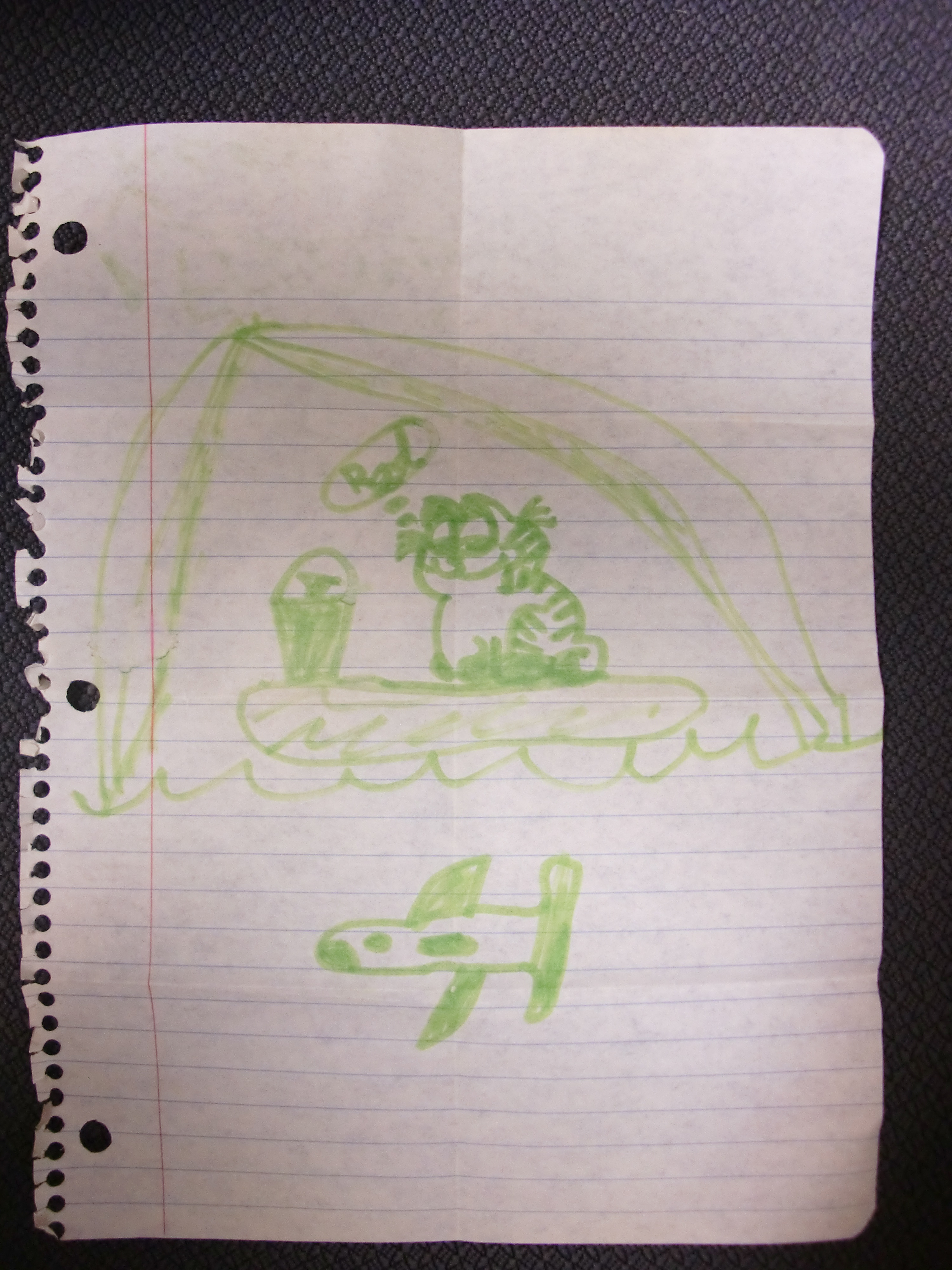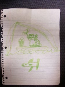 I also went through a collection of keepsakes in the antique trunk my mom gave me when I got married. I found portions of my childhood rock and shell collections, which I gave to my daughter, and several stuffed toys which I tossed towards the children and let them dive upon. Included in the bunch was a plush football with the initials of my high school on it that my brother made in home ec class, a hand-made “word fun” activity sheet (an Easter-themed word-find) that my sister made for me, I think when I left for college, and this: