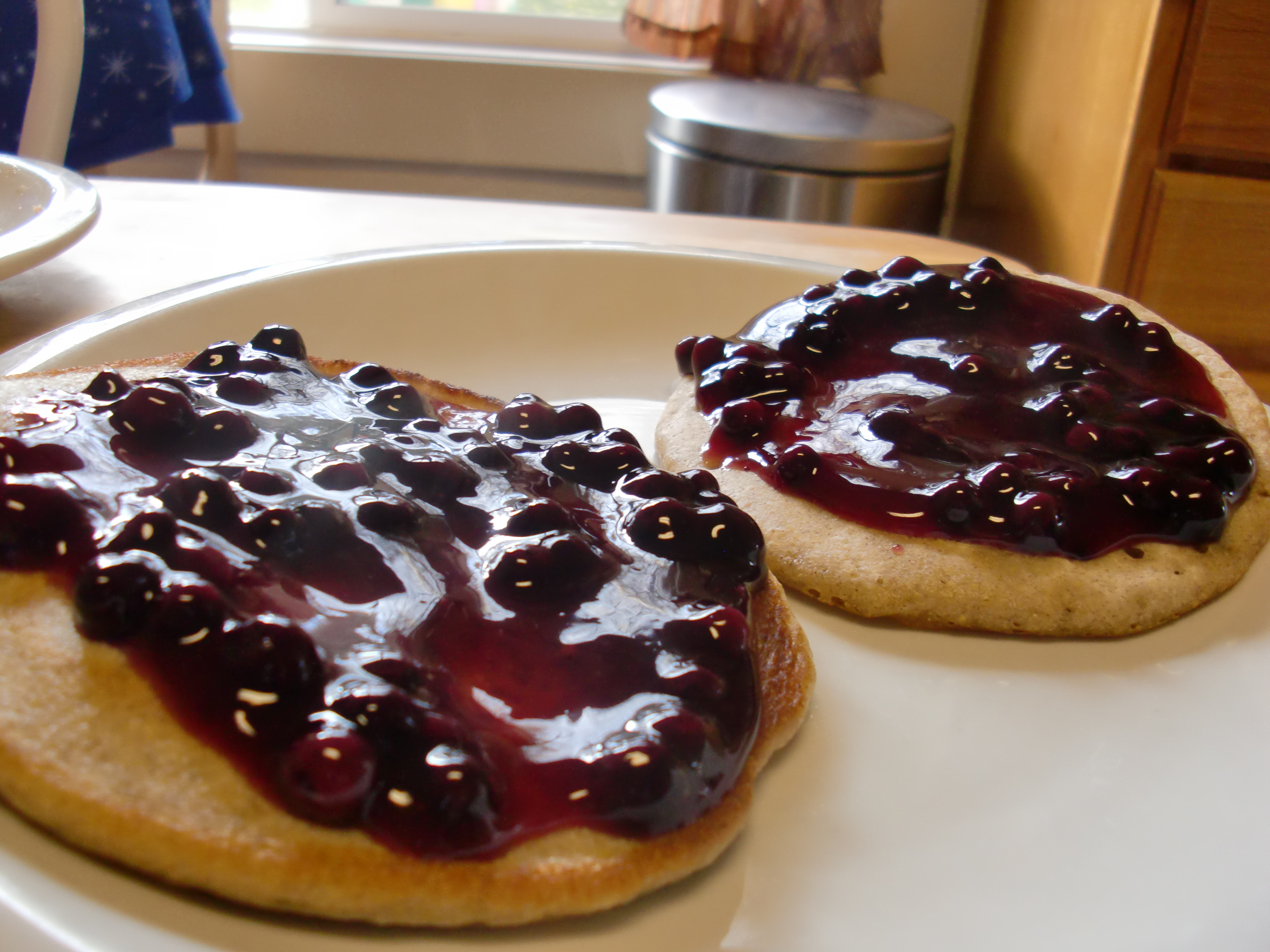 GF/CF Pancakes and Blueberry Sauce. Modified from "Goldie's Whole Grain Pancake Mix" in Feeding the Whole Family