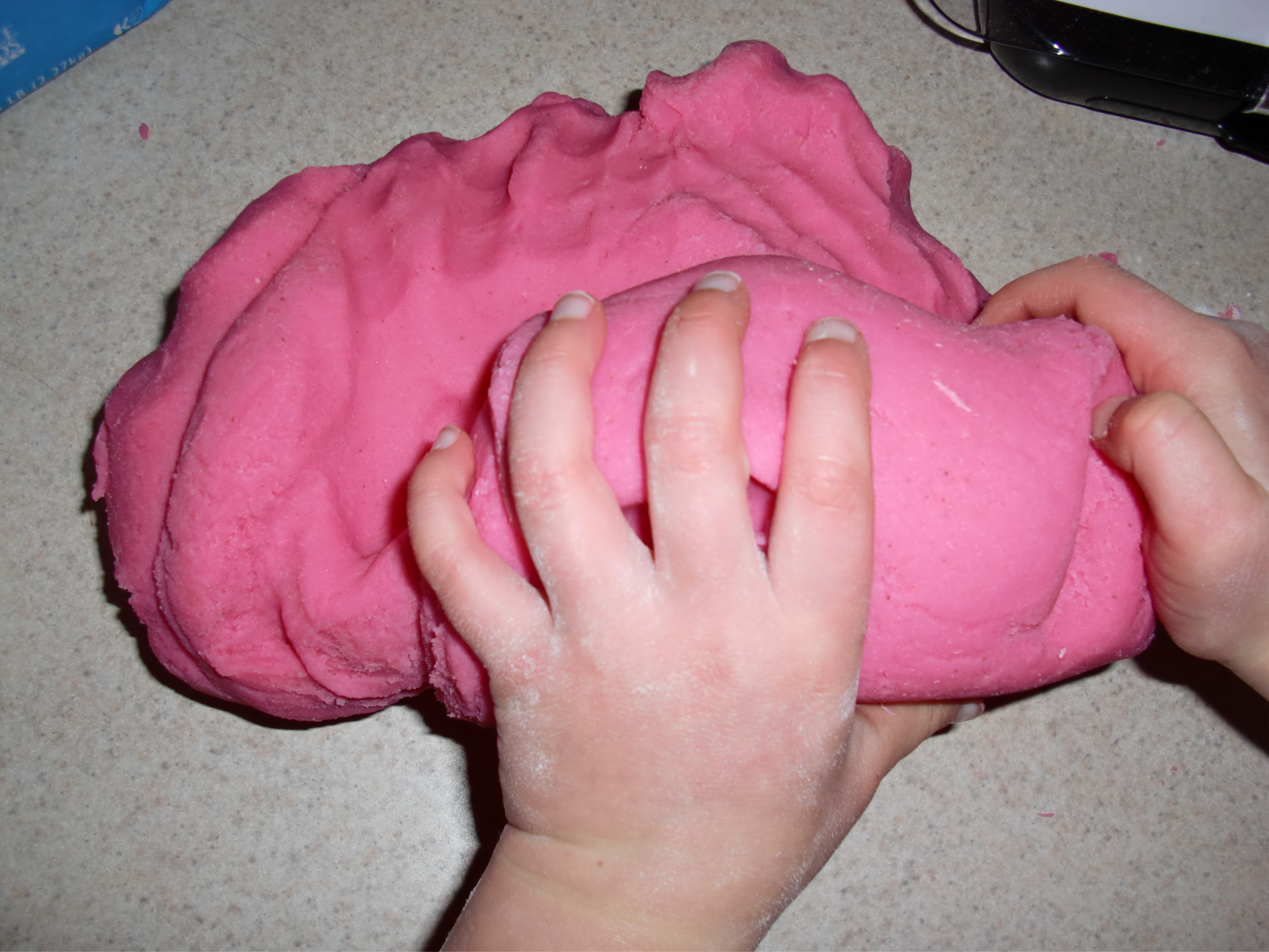 My play dough recipe is from another great book, Becoming the Parent You Want to Be. It’s 4 c flour (the bleached white kind works well for this), 2 c table salt, 4 T cream of tartar, 4 c water (with food coloring added, if desired), 2 T oil. Combine everything in a saucepan, heat over medium heat, stirring constantly, until the mixture is stiff (or until your arm falls off, whichever comes first). Don’t worry if it’s lumpy. Cool and knead. Store in an air-tight container. This dough will last a very long time (like, months) without getting yucky and smelly.