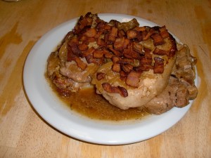 4. Transfer the pork chops to a serving platter with a large spoon, tent with foil, and let rest for 20 minutes (I think we left it for about 5). Let the cooking liquid settle for 5 minutes, then gently tilt the slow cooker and remove as much fat as possible from the surface using a large spoon. Remove the bay leaves, stir in the vinegar, and season with salt and pepper to taste. Reheat the bacon in the microwave on high power until heated through and crisp, about 30 seconds. Pour 1 cup of the sauce over the chops, sprinkle with the crisp bacon and parsley, and serve, passing the remaining sauce separately.