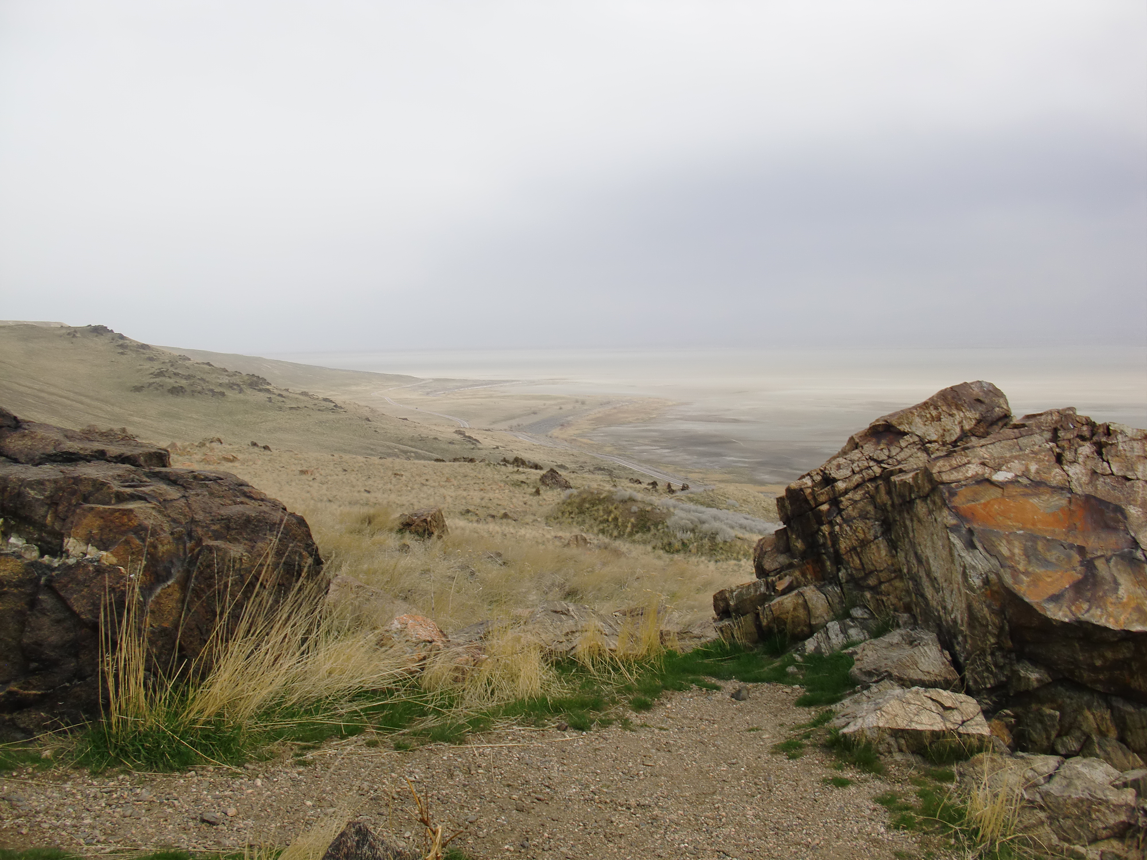 Before we left, friends told us, “This weather is perfect for Antelope Island! The cold and wind keep the bugs down!” Unfortunately, cold and wind also aren’t great for my kids. We chose a trail up to Frary Peak, the highest peak on the island (an elevation gain of >2000 feet from the trailhead). We knew we wouldn’t make it the whole way (it’s 6.6 miles round trip). As it turned out, though, we made it only about 1/4 mile up the slope before the whining and the fierce winds drove us back down to the parking area.