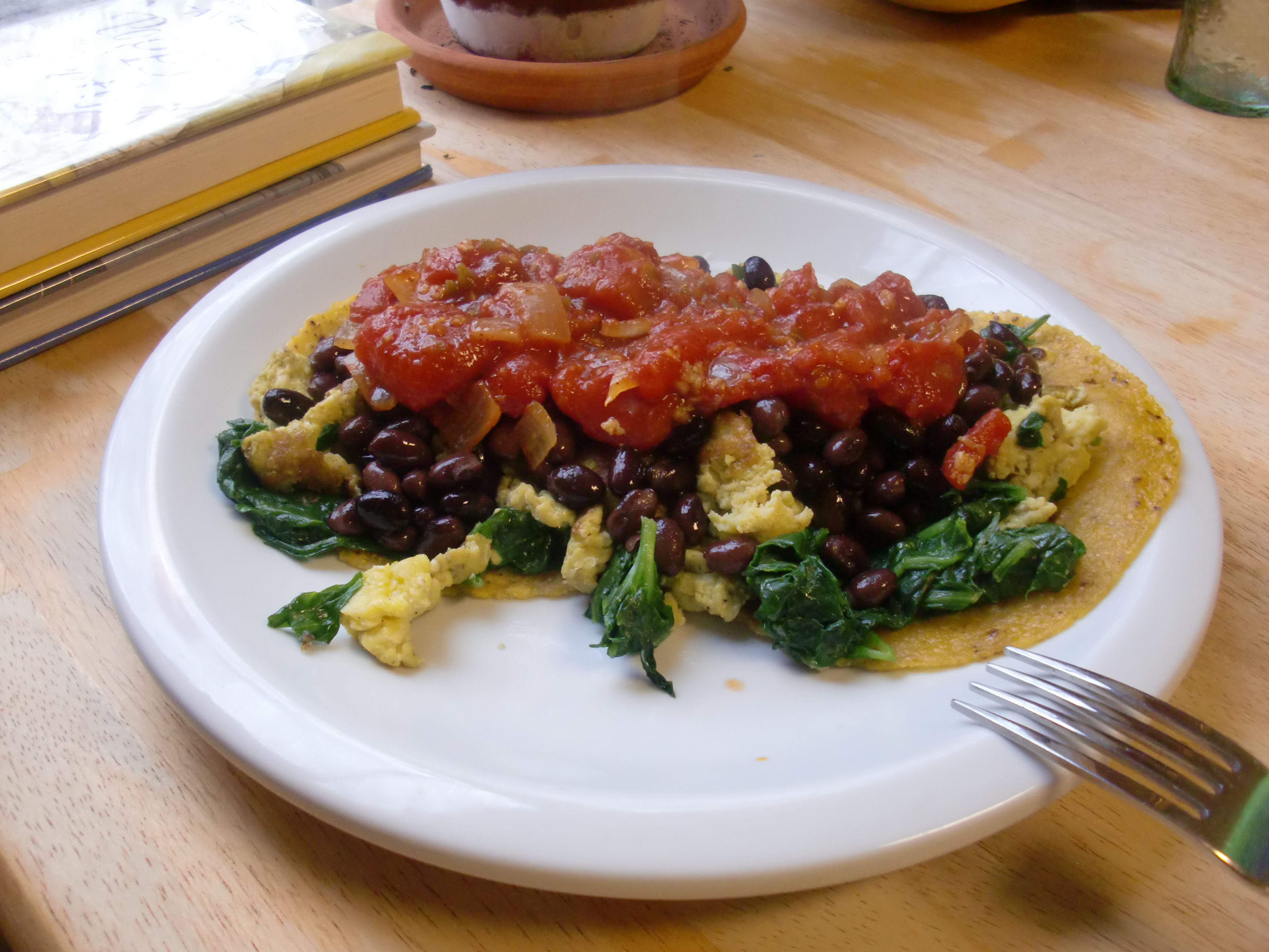 Tonight we decided to have eggs. But because of the need for leafy greens, I decided to have green eggs. And because of the need for beans, I decided to add black beans. And by that time it was near enough to huevos rancheros, I decided to just make a ranchero sauce and heat up some stone-ground corn tortillas (I’m allowed to have small quantities of corn).