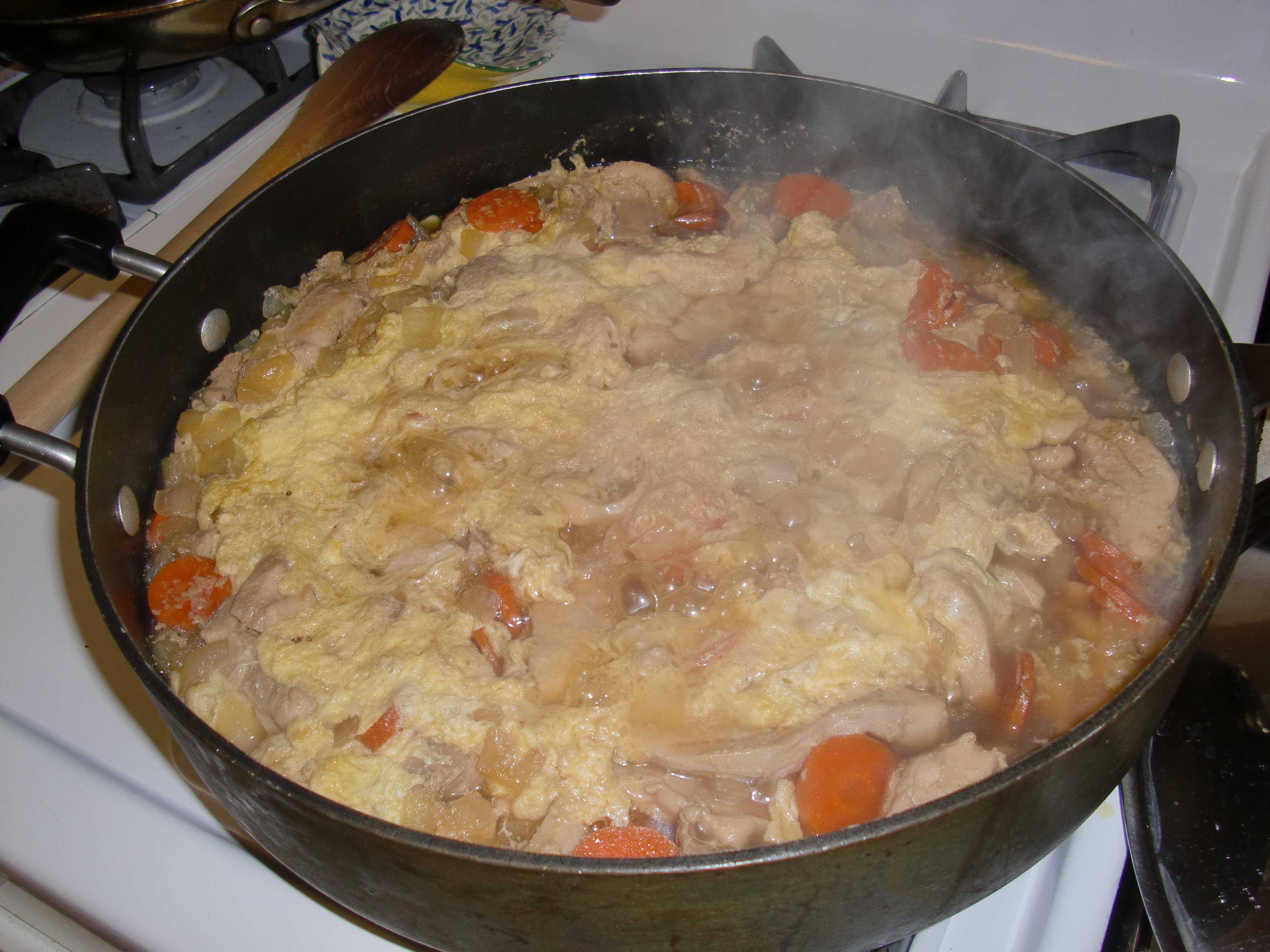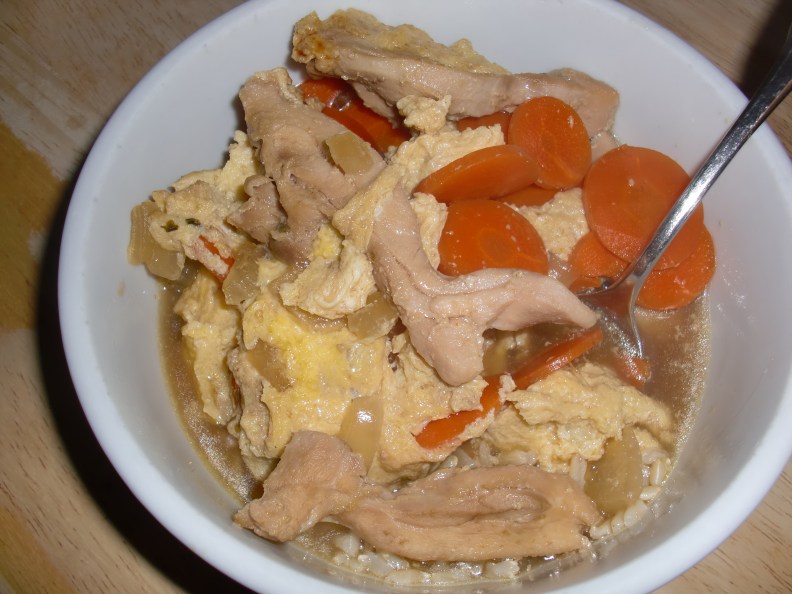 Oyako donburi means “parent and child rice dish.” It’s called parent and child because it has both chicken and egg in it. If you make it with beef and egg, it’s apparently called “stranger and child” which sounds kind of ominous. I’m thinking since I used turkey broth in it, I could call it “parent and child and cousin,” but I’d have to call it that in English because I don’t know the word for “cousin” in Japanese.