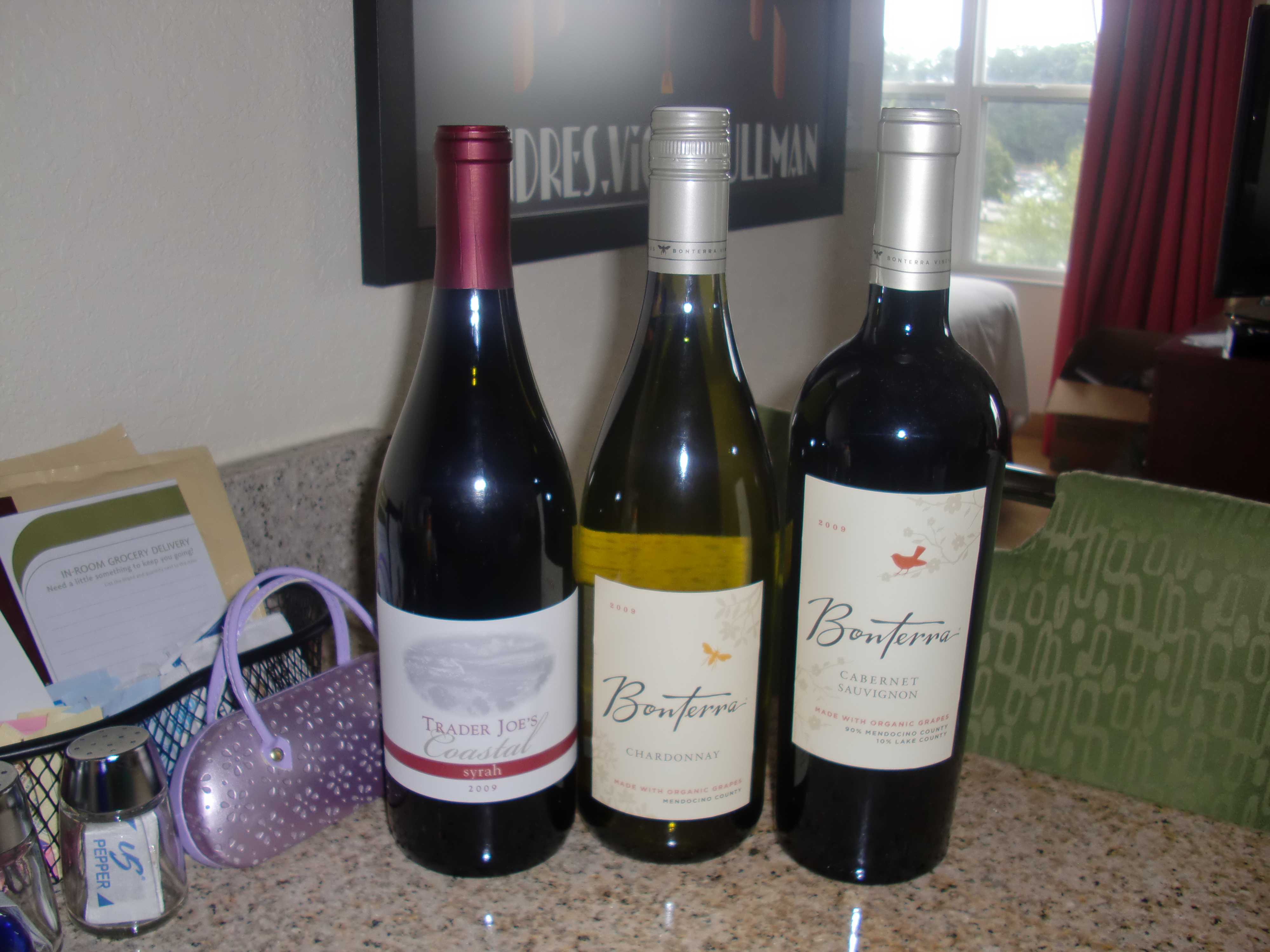But now we’re back in Trader Joe’s country. I got three well-priced bottles of wine, along with chocolate-covered frozen banana slices (which, it turns out, only I like), mini rice crackers, freeze-dried blueberries and strawberries, and a 4-flavor variety pack of hummus. I still like my hummus best, but until I get my VitaMix tamper back (I accidentally let the movers pack it), I’ll be relying on store-bought. And Joe’s hummus was pretty decent.
