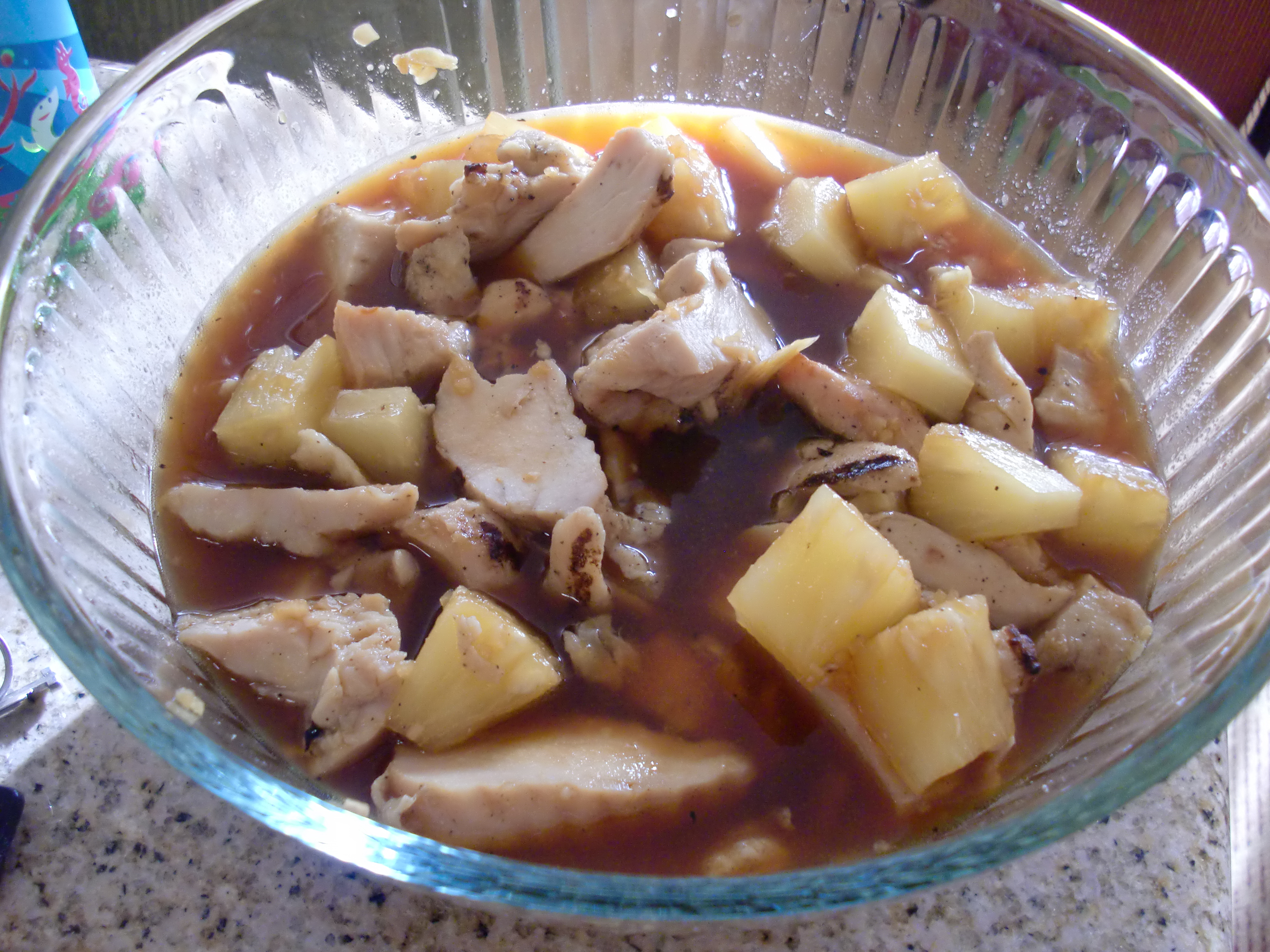 When they sampled it at the store, they used the Trader Joe’s brand Soyaki sauce. But that’s got wheat in it, so I passed on that and created my own. It’s Trader Joe’s pre-cooked frozen chicken breast strips, their canned pineapple chunks (with juice), and a sauce made of wheat-free tamari, canned minced garlic, fresh ginger, and a touch of honey. I mixed the sauce while thawing the chicken, then tossed it all together.