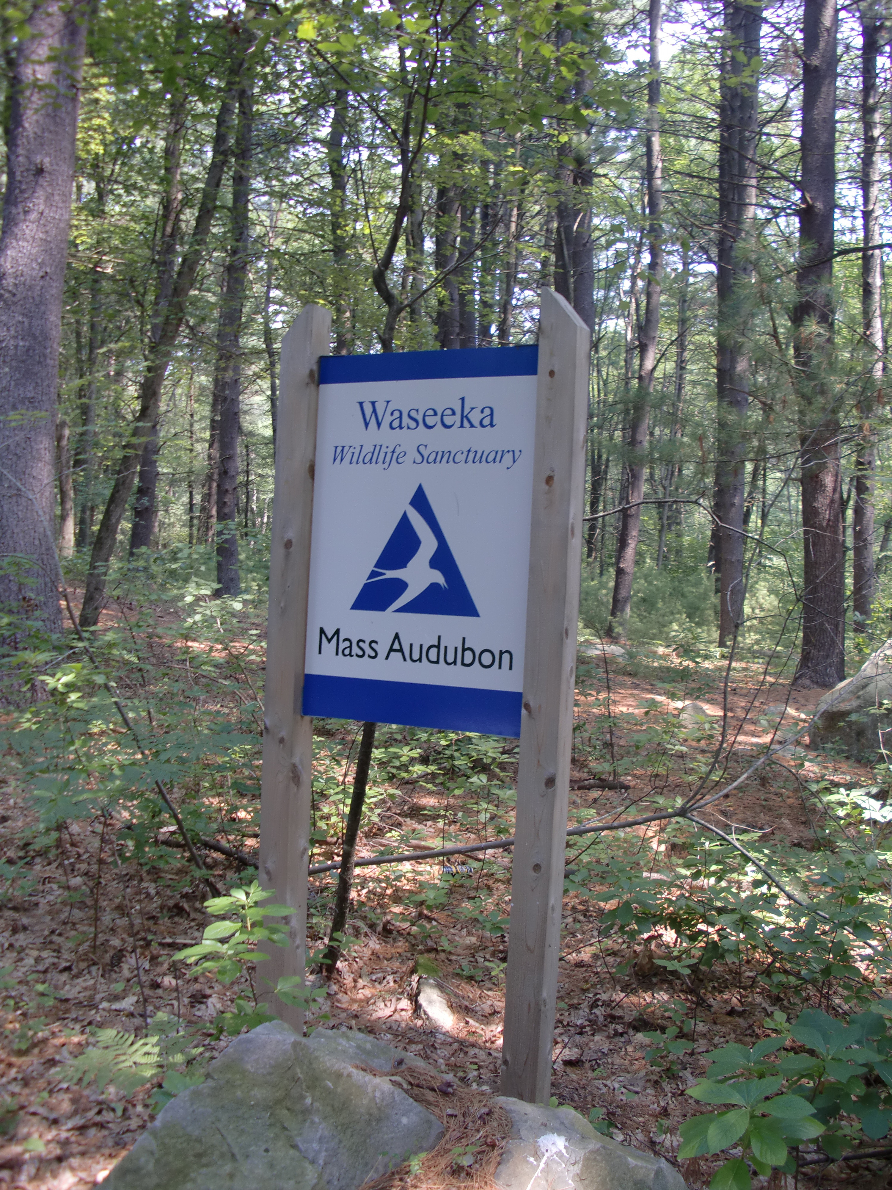 For all of the hikes, we followed the directions to Waseeka listed on the site (the site warns against using GPS or online directions to find the sanctuary), which were easy to follow, for the most part. We almost missed the turn into the parking area, though. The sign is clearly lettered but rather small and points directly towards the street rather than angling one direction or another, so you have to be pretty much on top of it to see it. You drive between two trees to enter the parking area. There’s no information kiosk and no trail maps, but the trails are easy enough, you don’t really need a map.