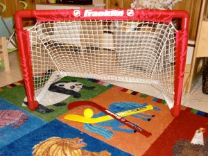 My brother- and sister-in-law bought my son a toy hockey set (goal, two tiny sticks, and two balls) for his second birthday. He loves this hockey set.