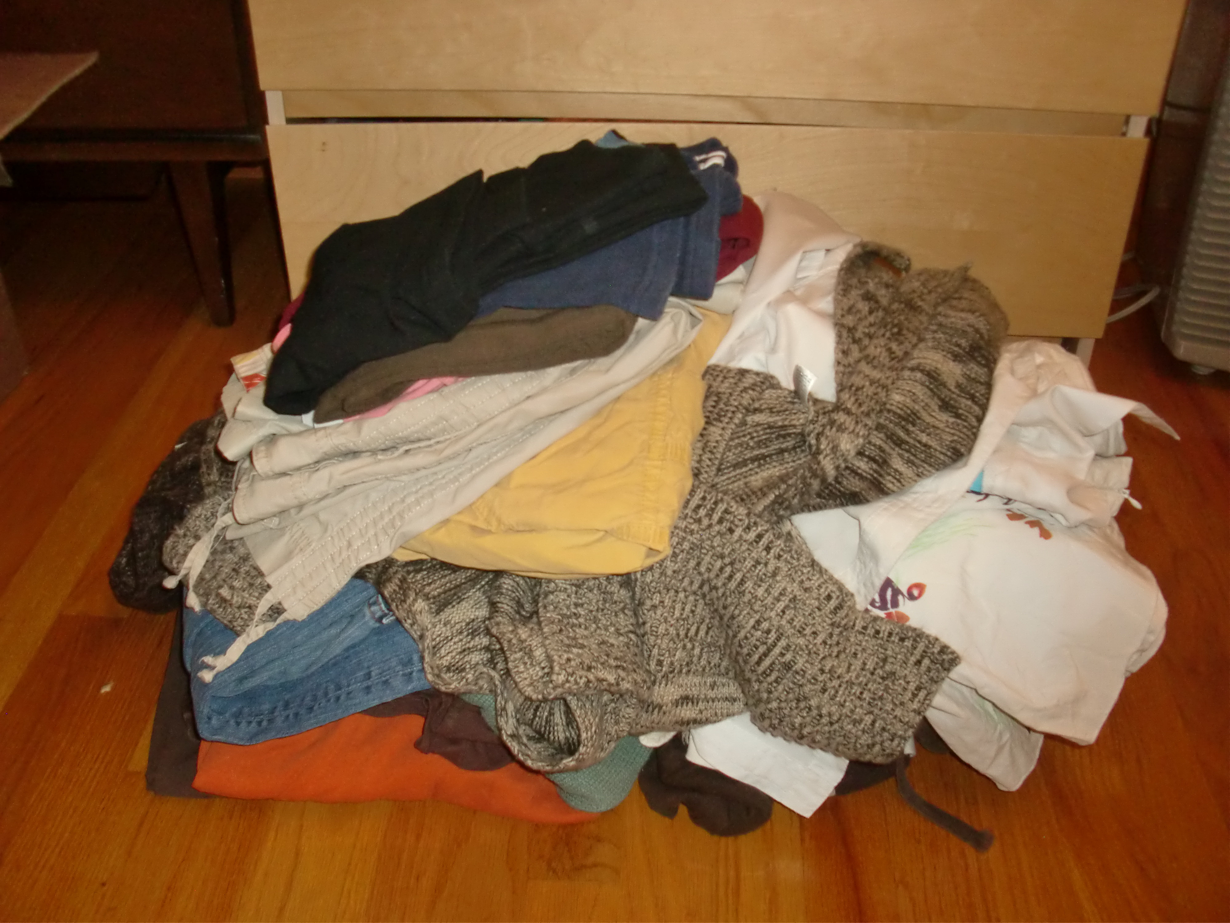 I cleared out about half of my clothes. I left in two skirts that I think aren’t supposed to be there. Shorties like me aren’t supposed to wear floor-length skirts because it makes us look even shorter, but I love these two skirts and I’m not ready to part with them. But aside from those, I stuck pretty close to the rules. This means I got rid of all of my brown.