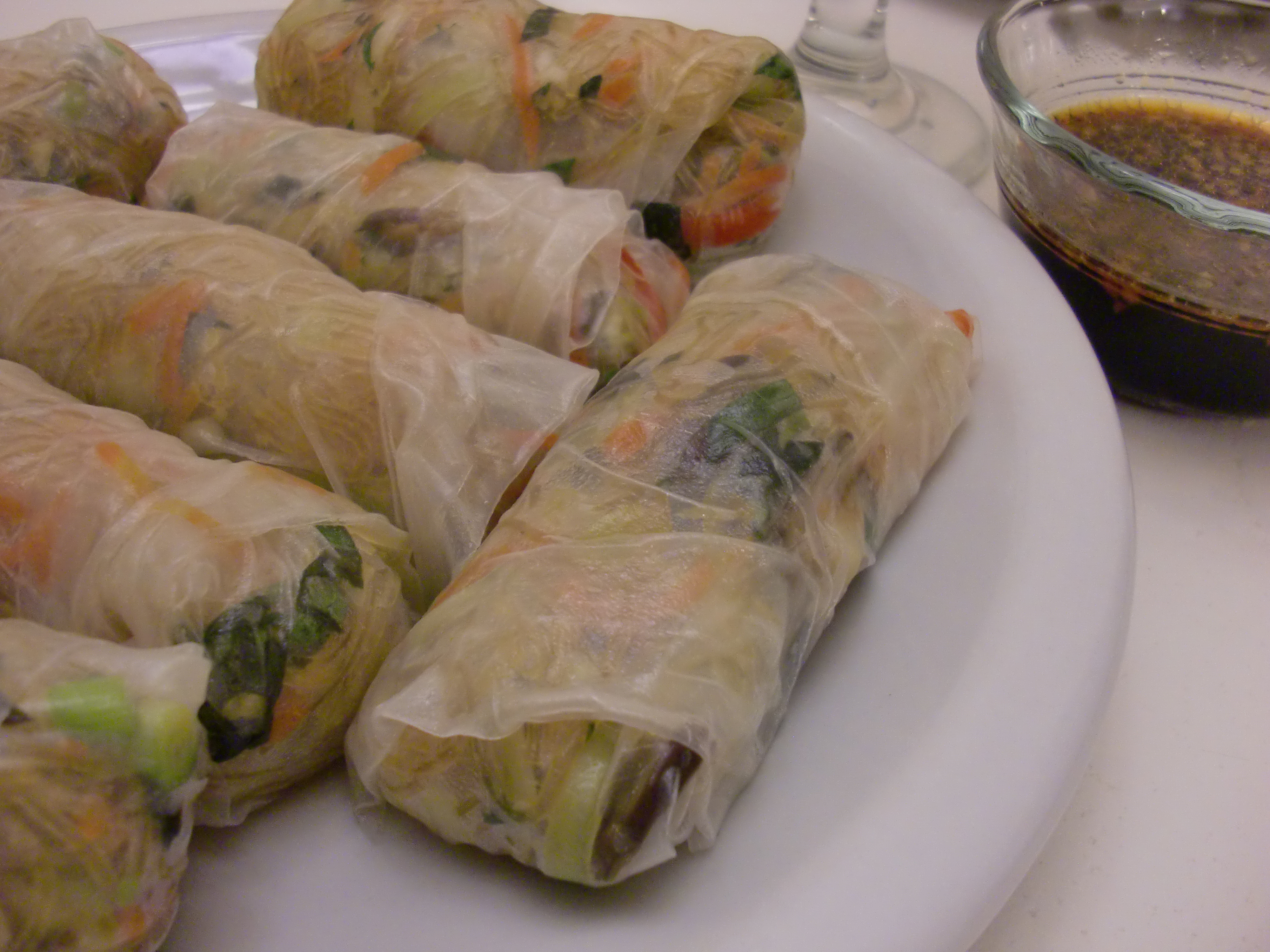 I’ve tried making spring rolls before using raw vegetable fillings, and they were kind of ho-hum. These Vegetable Rolls are not ho-hum. The vegetables are lightly sauteed, dressed in a basic sauce, and mixed with fresh tarragon and basil before they’re rolled in the rice papers. The result is a tasty, fresh, satisfying meal that’s well worth the time it takes to prepare.