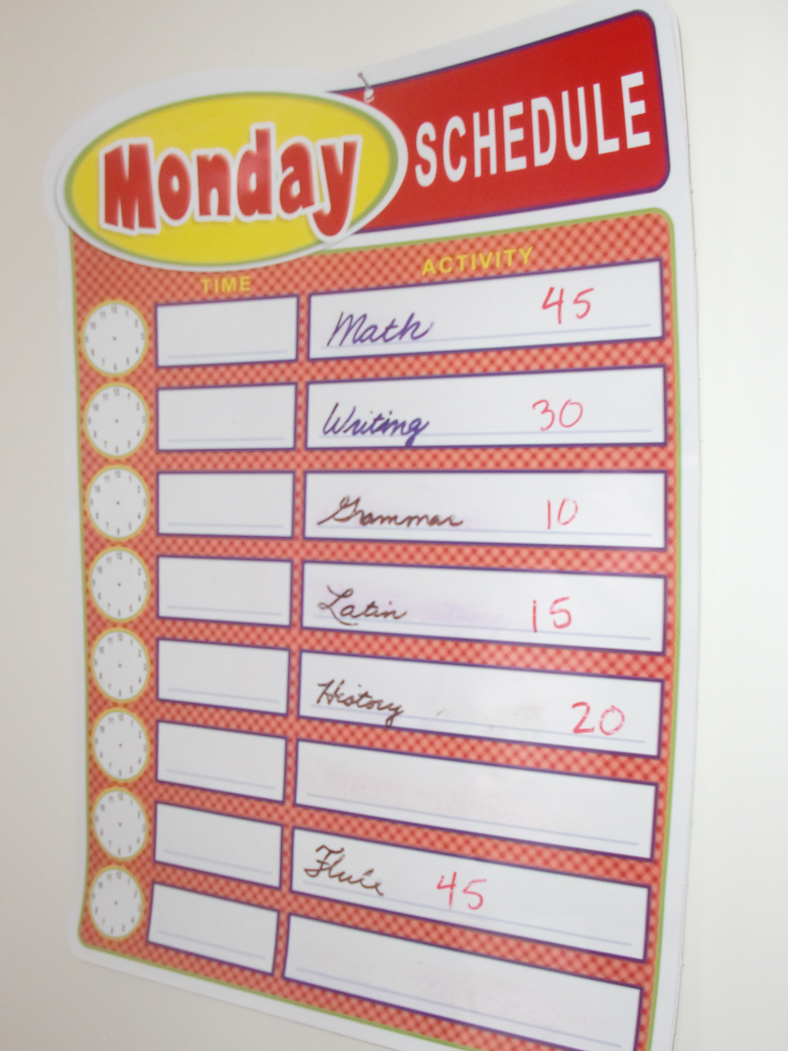Autumn through spring, we do lessons in the mornings and do outings in the afternoons; in summer that’s reversed so that we can have outside time before the heat of the day. Each morning (or if I’m particularly organized, each night before I go to bed), I post a list of subjects on our dry-erase schedule pages. Then I let my daughter decide the order in which to do things. I’ve begun listing the amount of time I expect each subject to take to help my daughter with her planning.