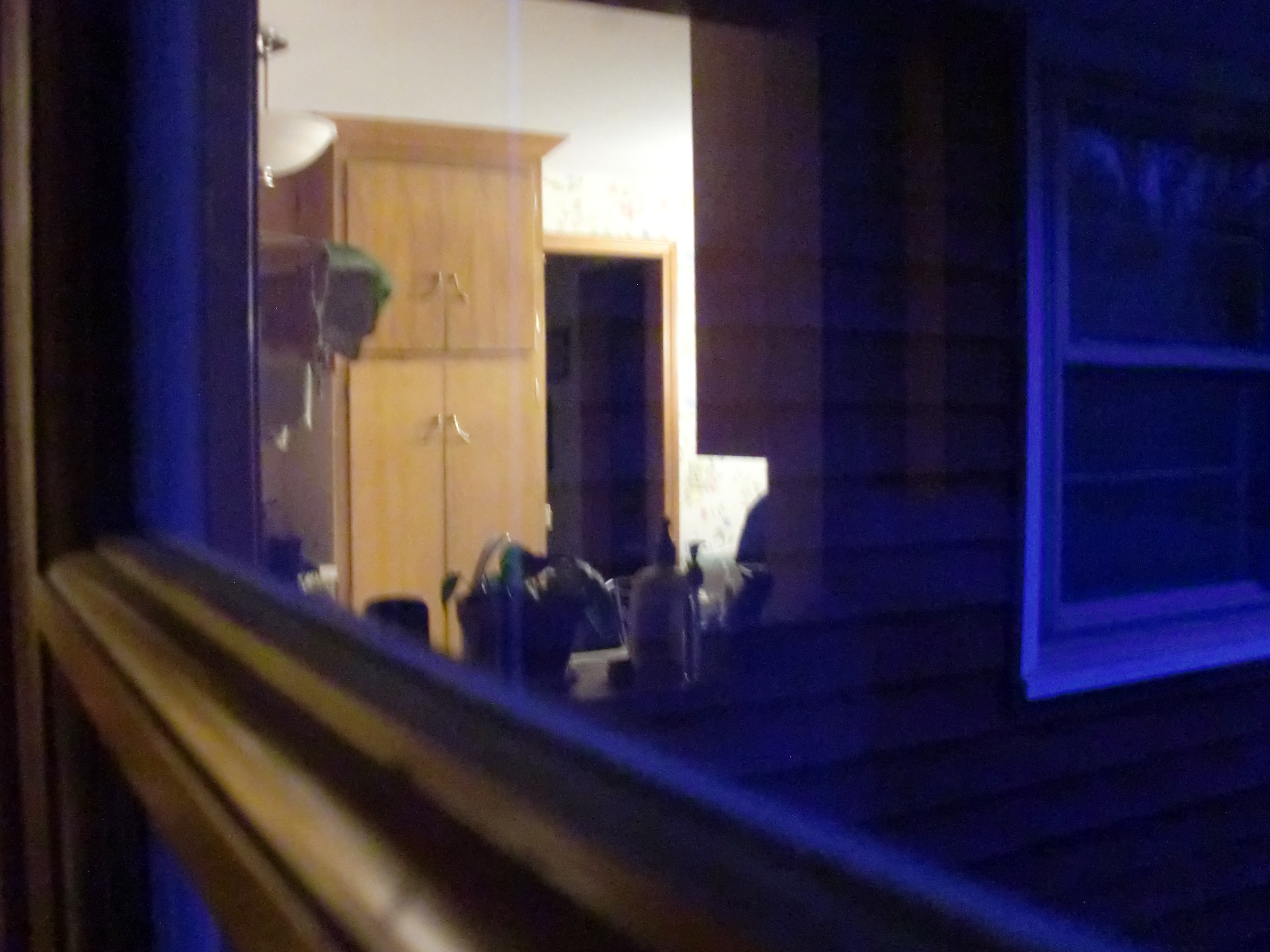 The kitchen reflected in the toy room window, December 2013.