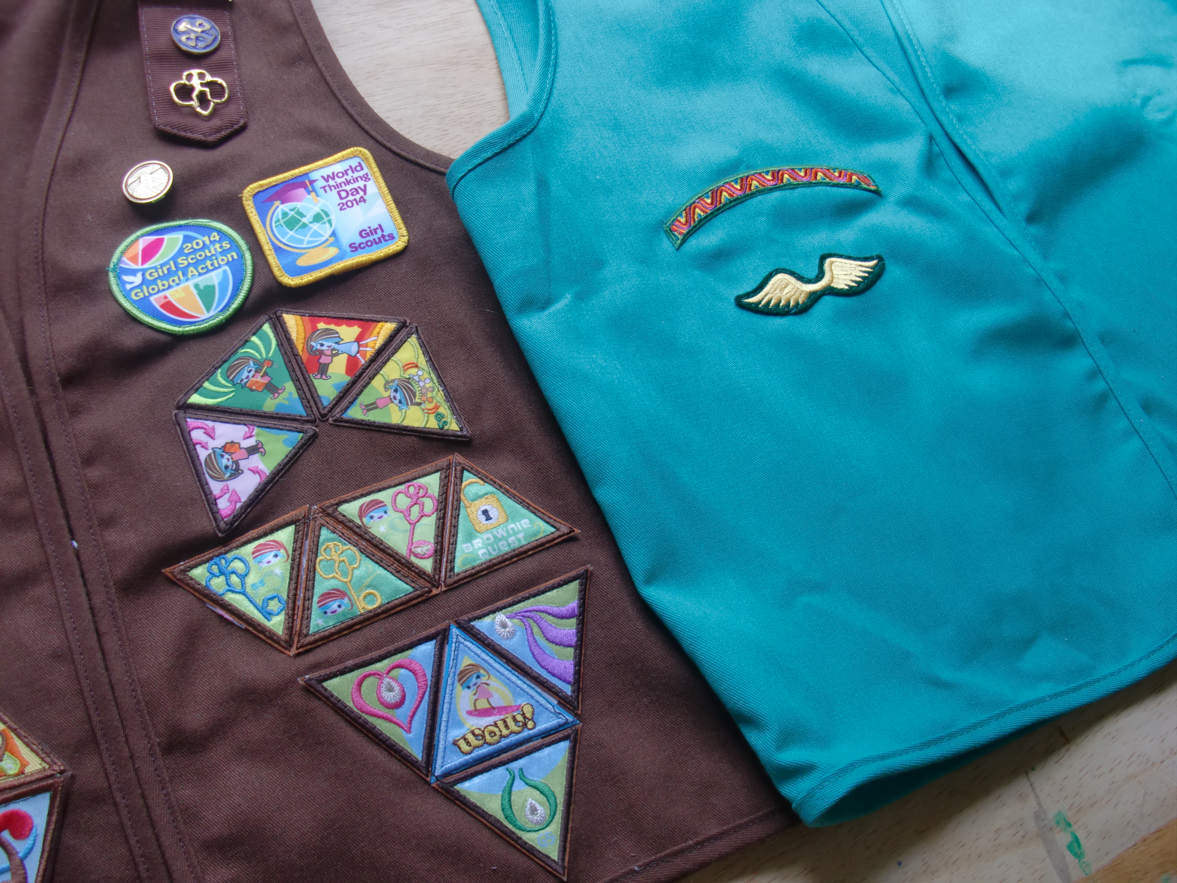 Tonight I had two vests to work on: my daughter’s brown Brownie vest, which needed to be updated before the next week’s bridging ceremony, and her brand-new green Junior vest. After two years as a Brownie, it was time for her to level up.