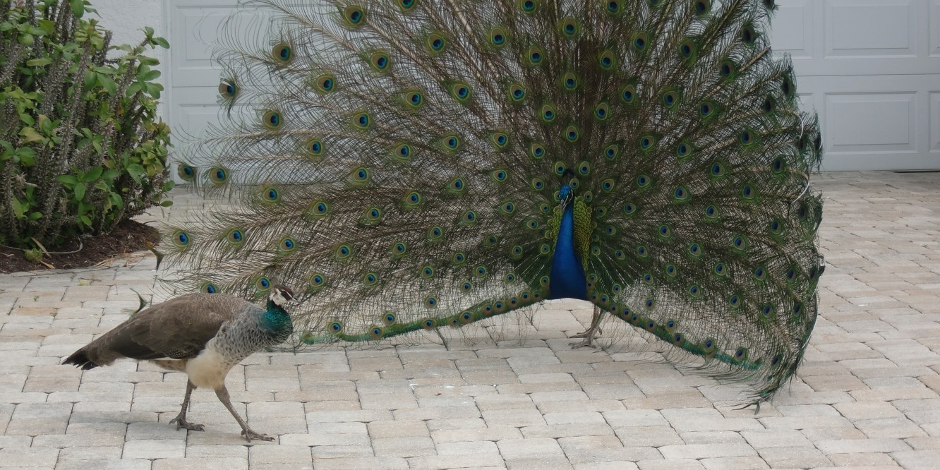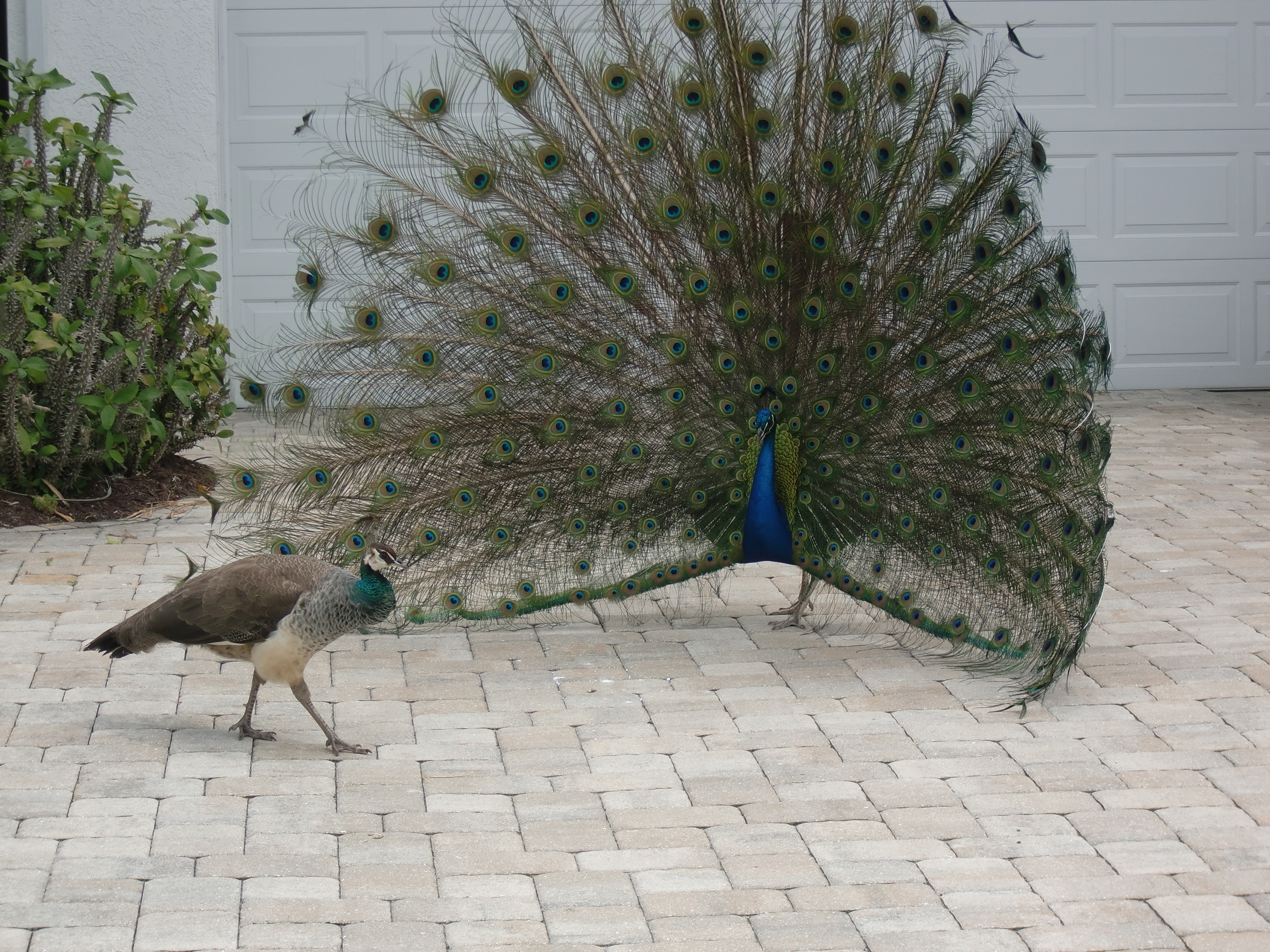 A peacock decides this driveway in suburban Florida is a good place to pick up chicks—er, hens.