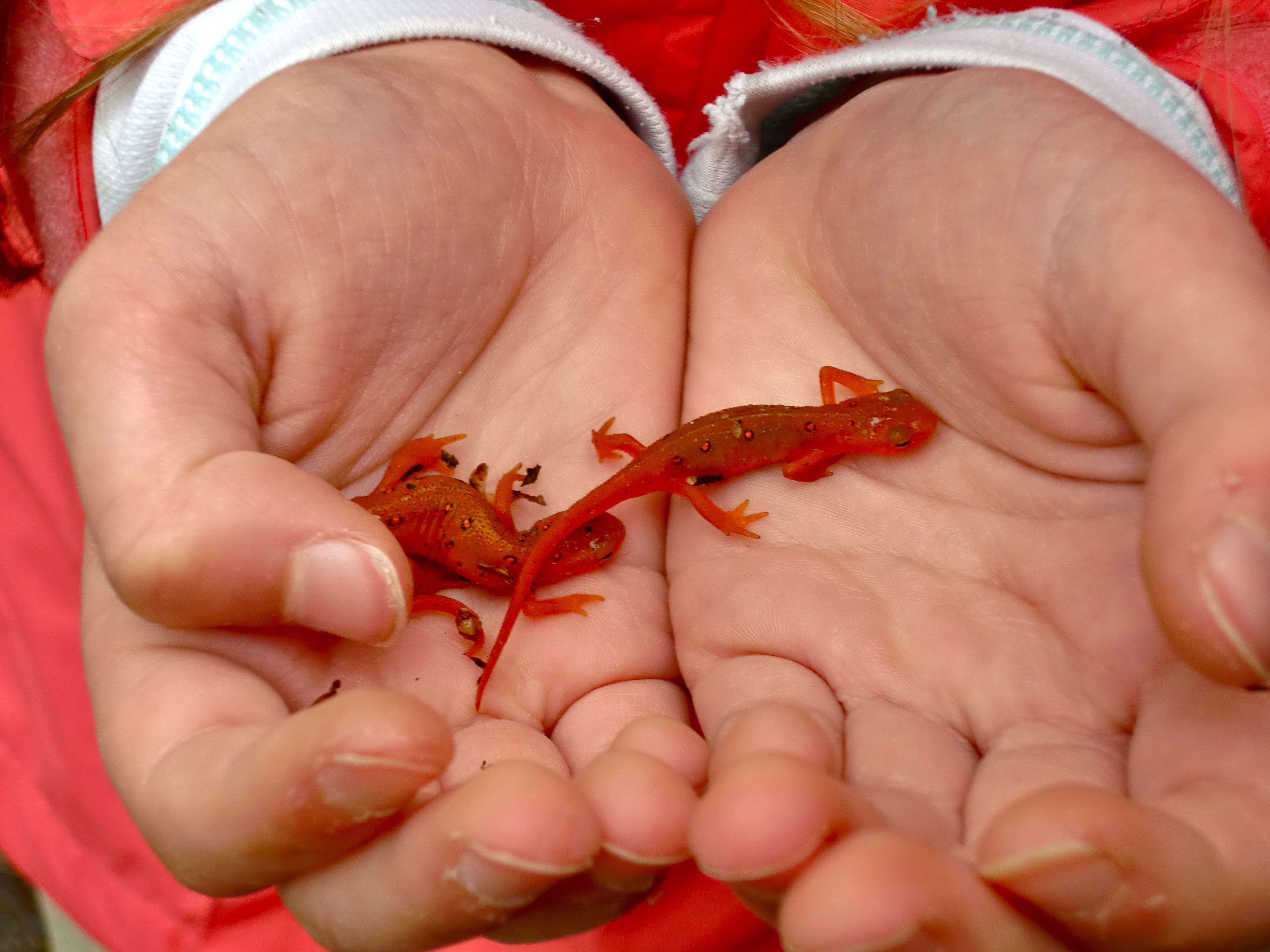 We love red efts around here. My children insist on rescuing every eft we find in the path when we’re hiking. Despite their bright color, they blend in very well on the ground, and my kids worry they’ll get stepped on. They always take me a little by surprise, even when I know to expect them.
