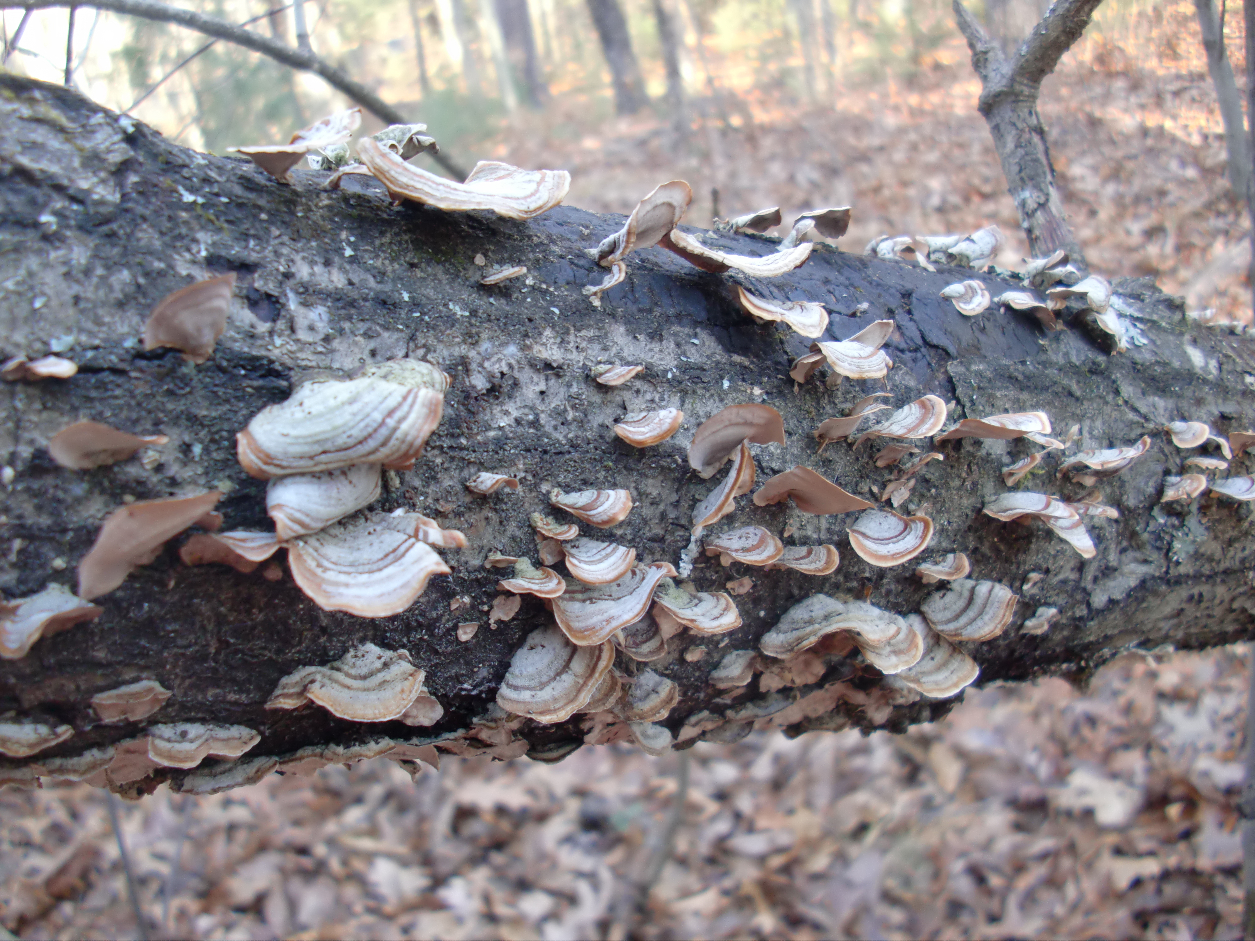 Turkey Tail fungus (Trametes versicolor). My kids identified these.