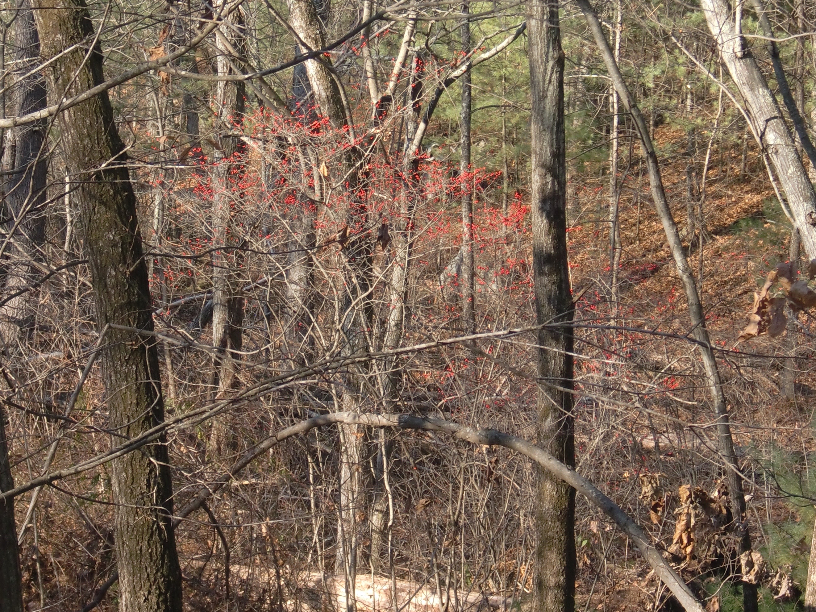 Winterberry (Ilex verticillata) from a distance. In my peripheral vision, these registered as just a red haze, which was confusing to me until I turned my head and saw it was actually berries.