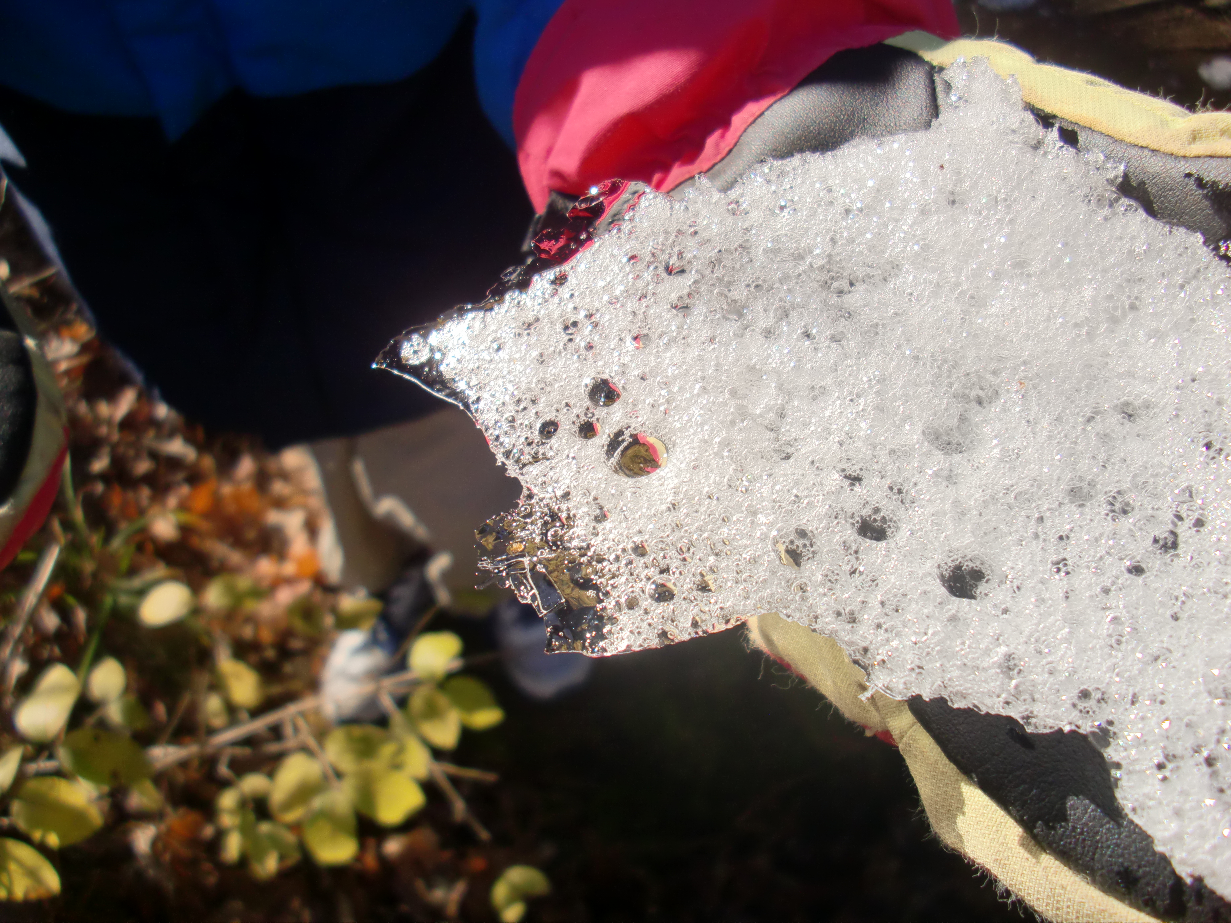 My kids were thrilled because when they pressed on ice near the shore, water splashed up from underneath the other edge of the ice out in the middle of the water. They also liked that when my son tossed frozen dirt clods onto the ice, neither the ice nor the dirt clods broke apart. The dirt clods simply skittered across the surface.