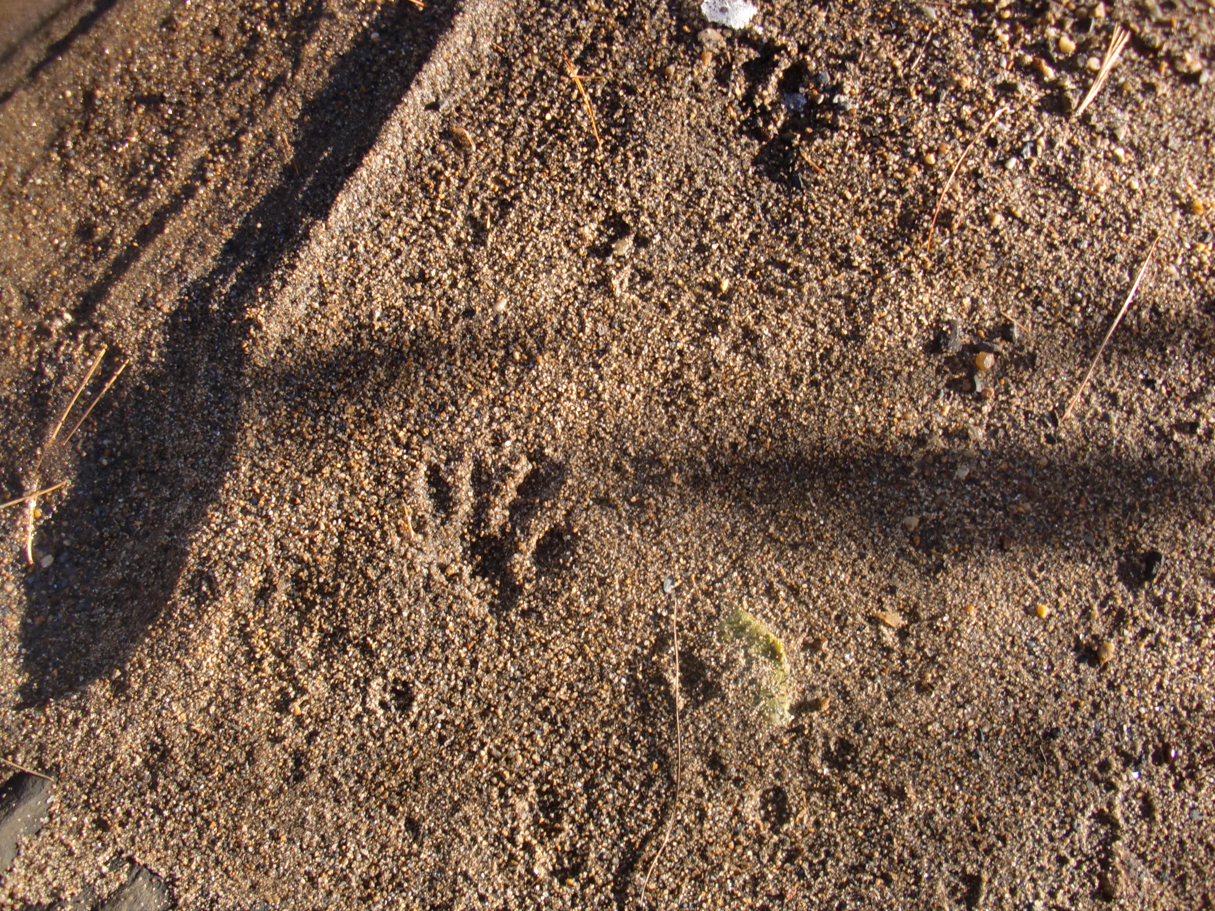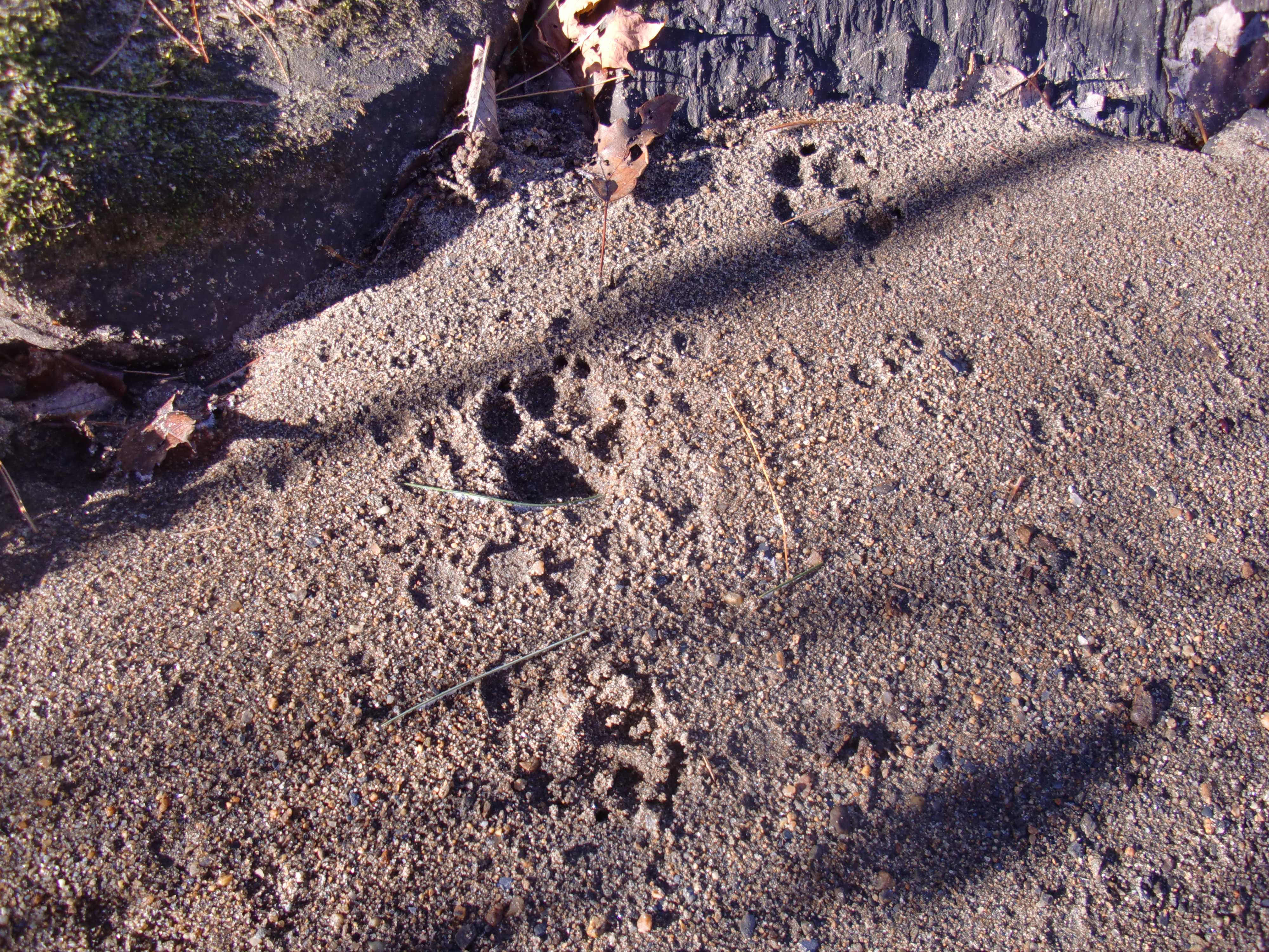 Animal tracks on the sandy spot next to the creek that we call “Squirrel Beach”. We think these are dog (Canis lupus familiaris) and raccoon (Procyon lotor).