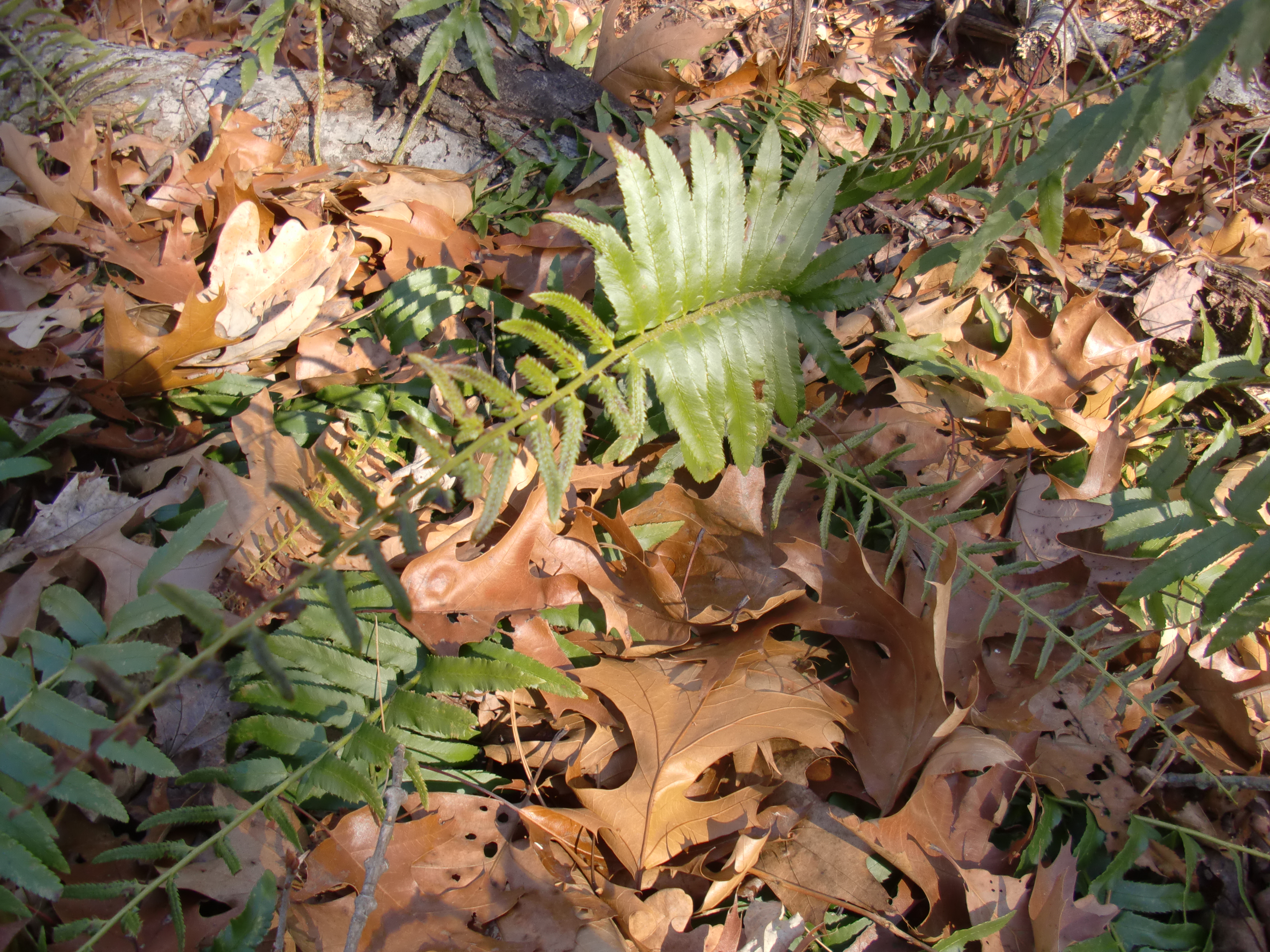 A new (to us) type of fern. Maybe it’s Polystichum acrostichoides or Polypodium appalachianum? Or maybe it’s neither of these. Ferns are somewhat mysterious to me. The smaller pinnae near the ends of the fronds have brownish undersides on which my camera refused to focus.