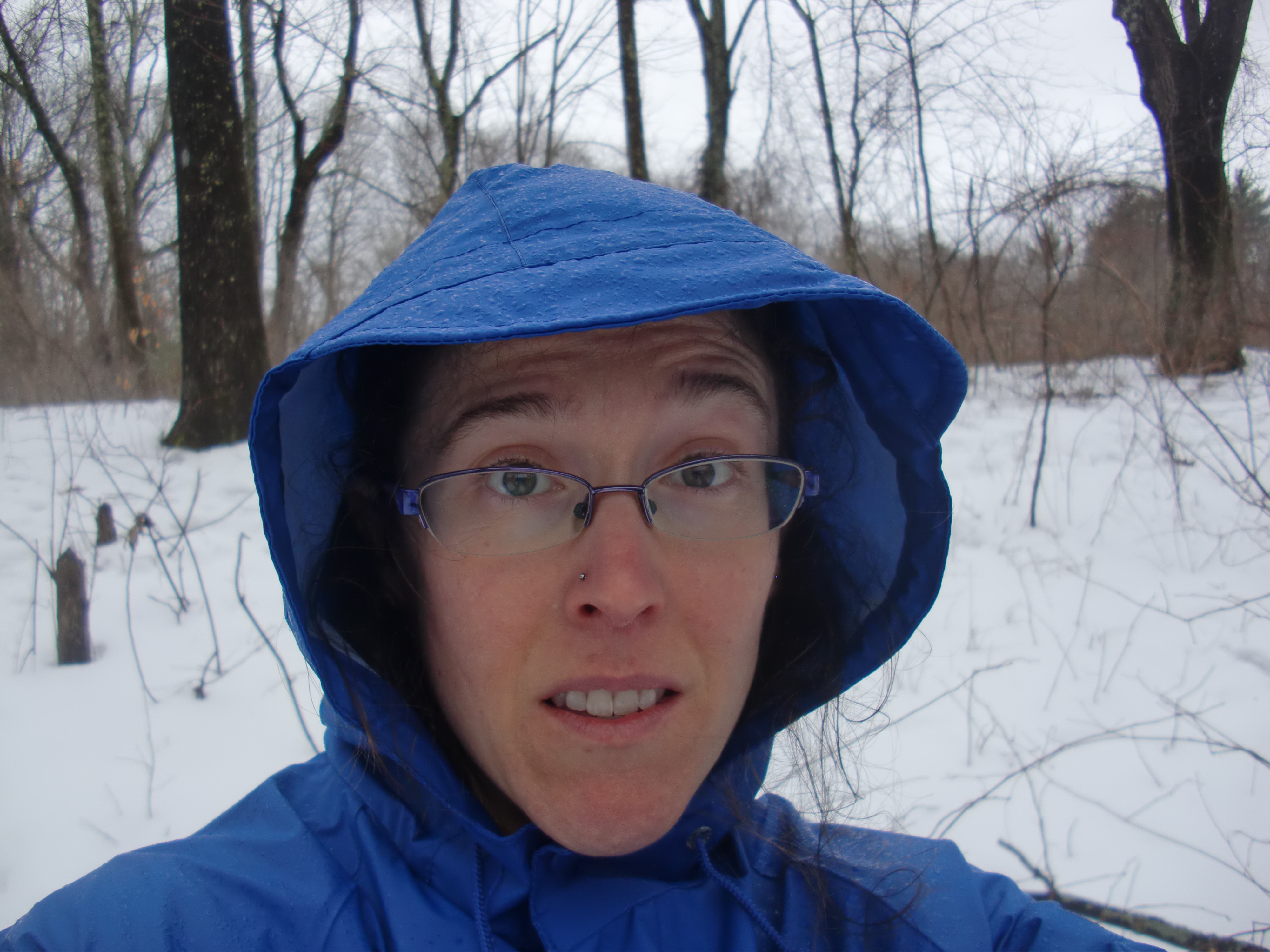 For this hike, it was 52°F and rainy, so we wore rain suits. We also wore traction devices but since it was slushy and messy rather than icy, we didn’t really need them. My son took his off halfway through.