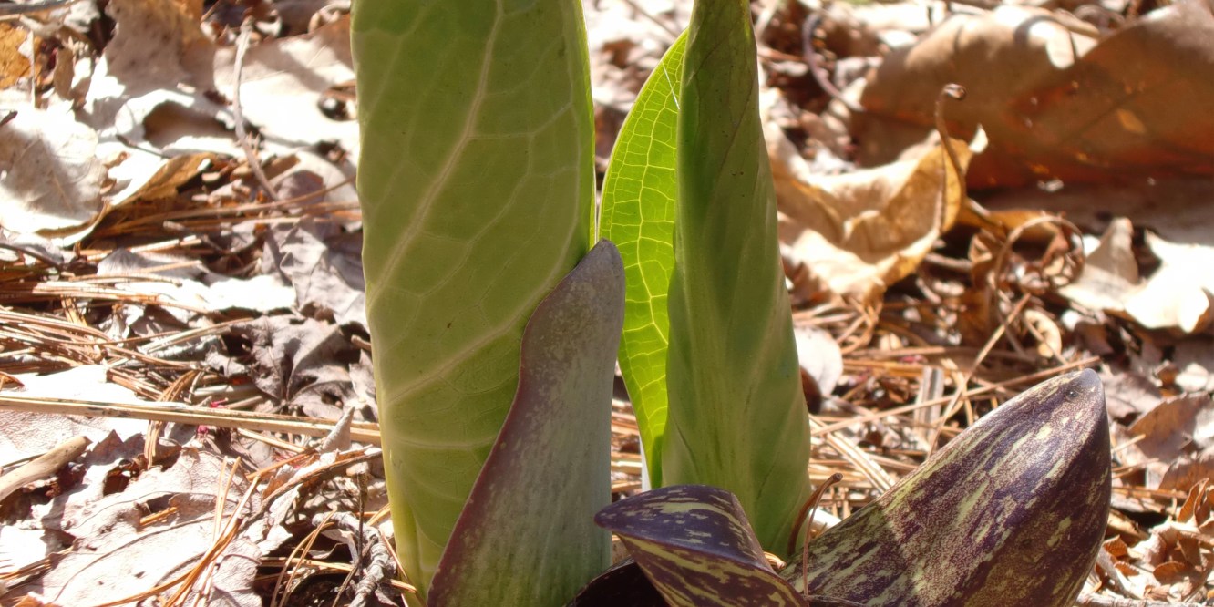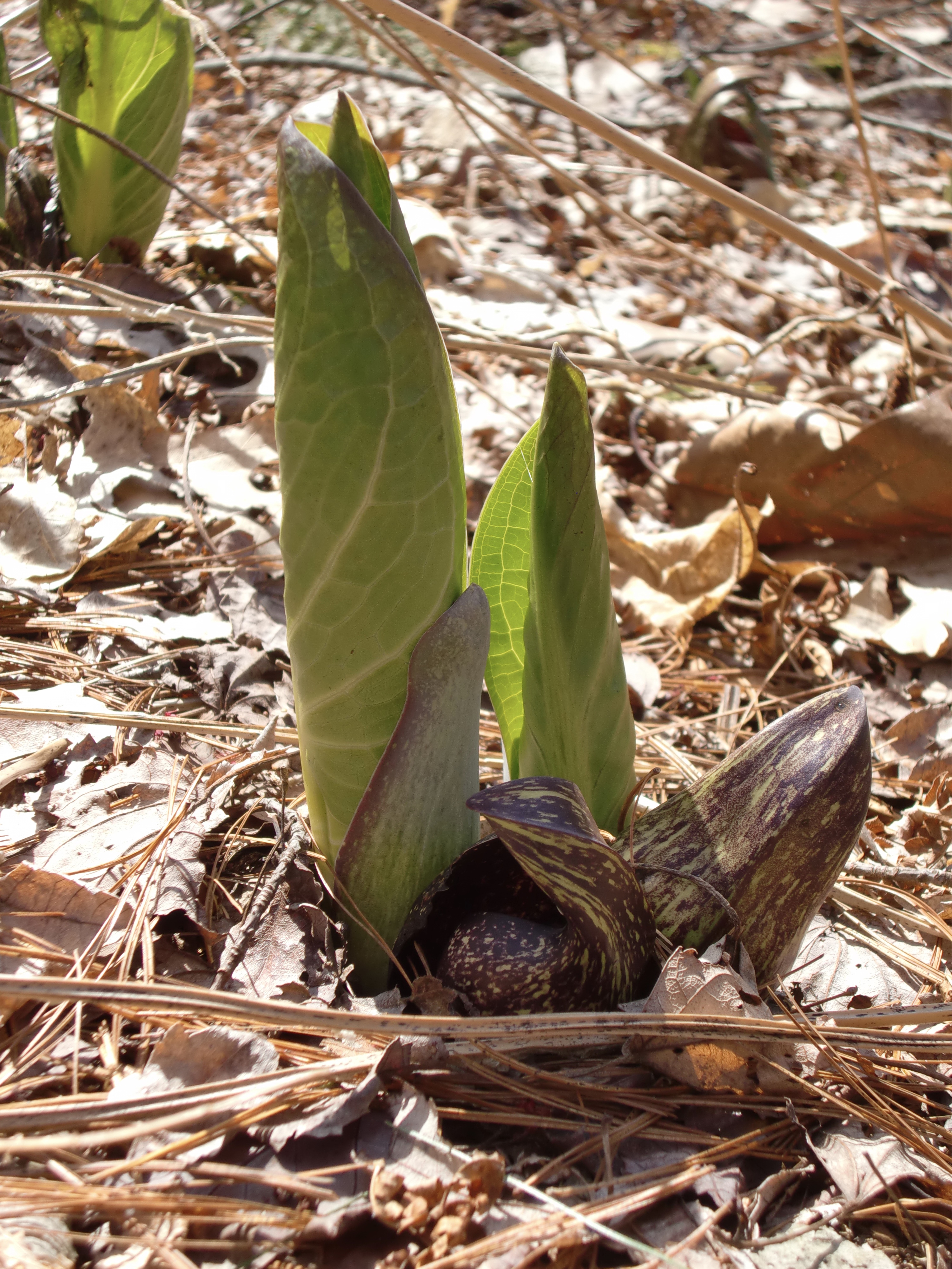 We took a bonus hike on our sunny Sunday afternoon, and through my daughter’s detective work determined that the leafy green plant we’ve been seeing all over the place is Skunk Cabbage (Symplocarpus foetidus). What we’d recognized as skunk cabbage was just the flower. The big, green, cabbage-y leaves are what come after. My daughter figured this out when she spotted some plants in between stages.