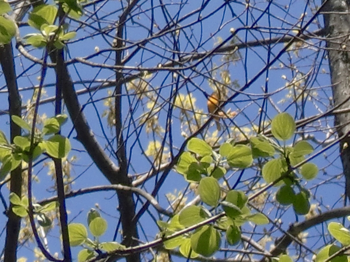 Near the creek, we heard a birdsong we’d not heard before. I looked up and saw a bright orange bird singing high up in the trees. I couldn’t get a great shot of him with all of the branches crisscrossing between him and me, but here’s a glimpse: