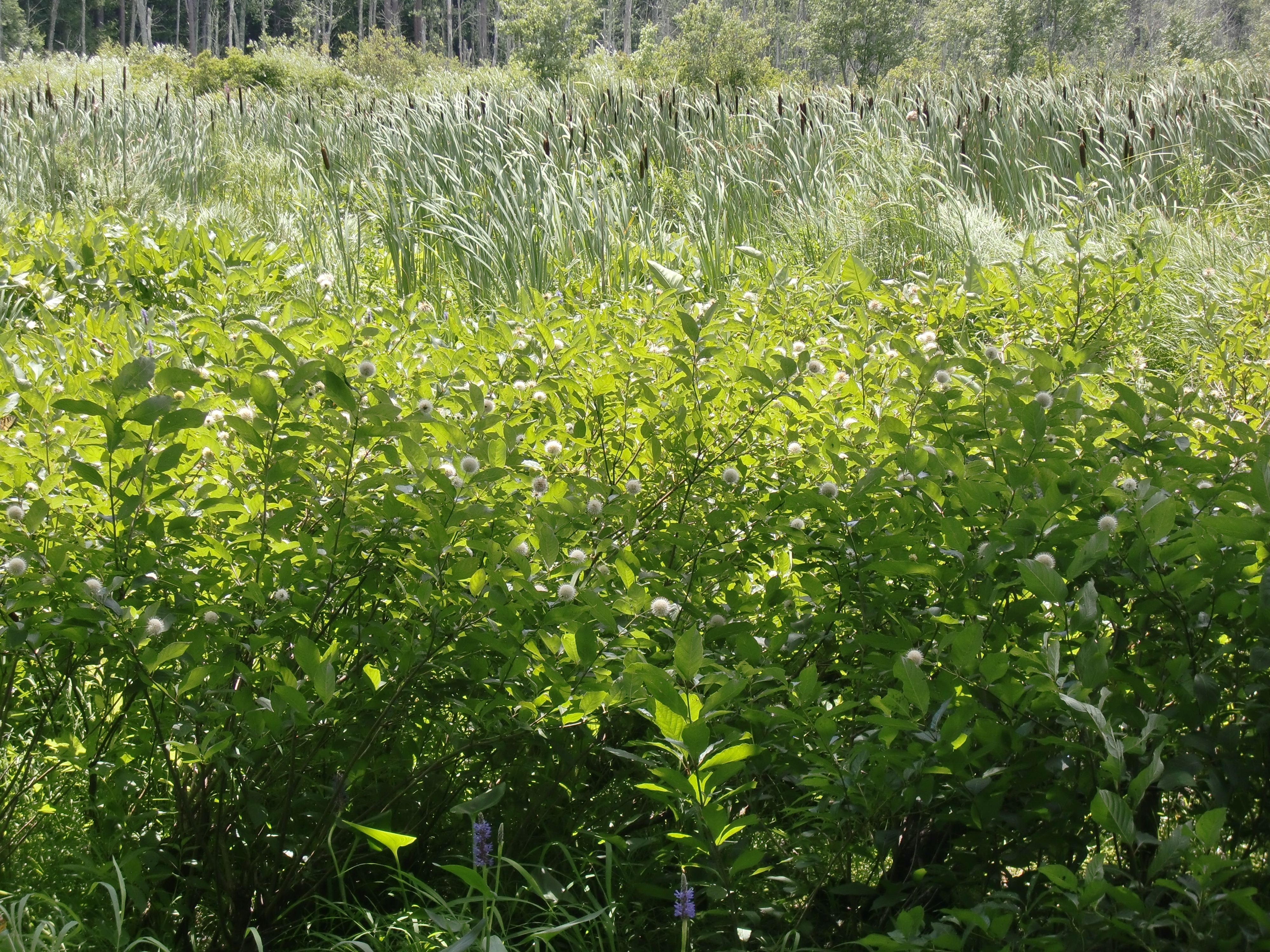 Luckily, we did not see only invasive and/or destructive creatures. We also spotted a native wetland plant: buttonbush (Cephalanthus occidentalis). The buttonbush is in front of the cattails. It’s the plant with the white puffy ball things