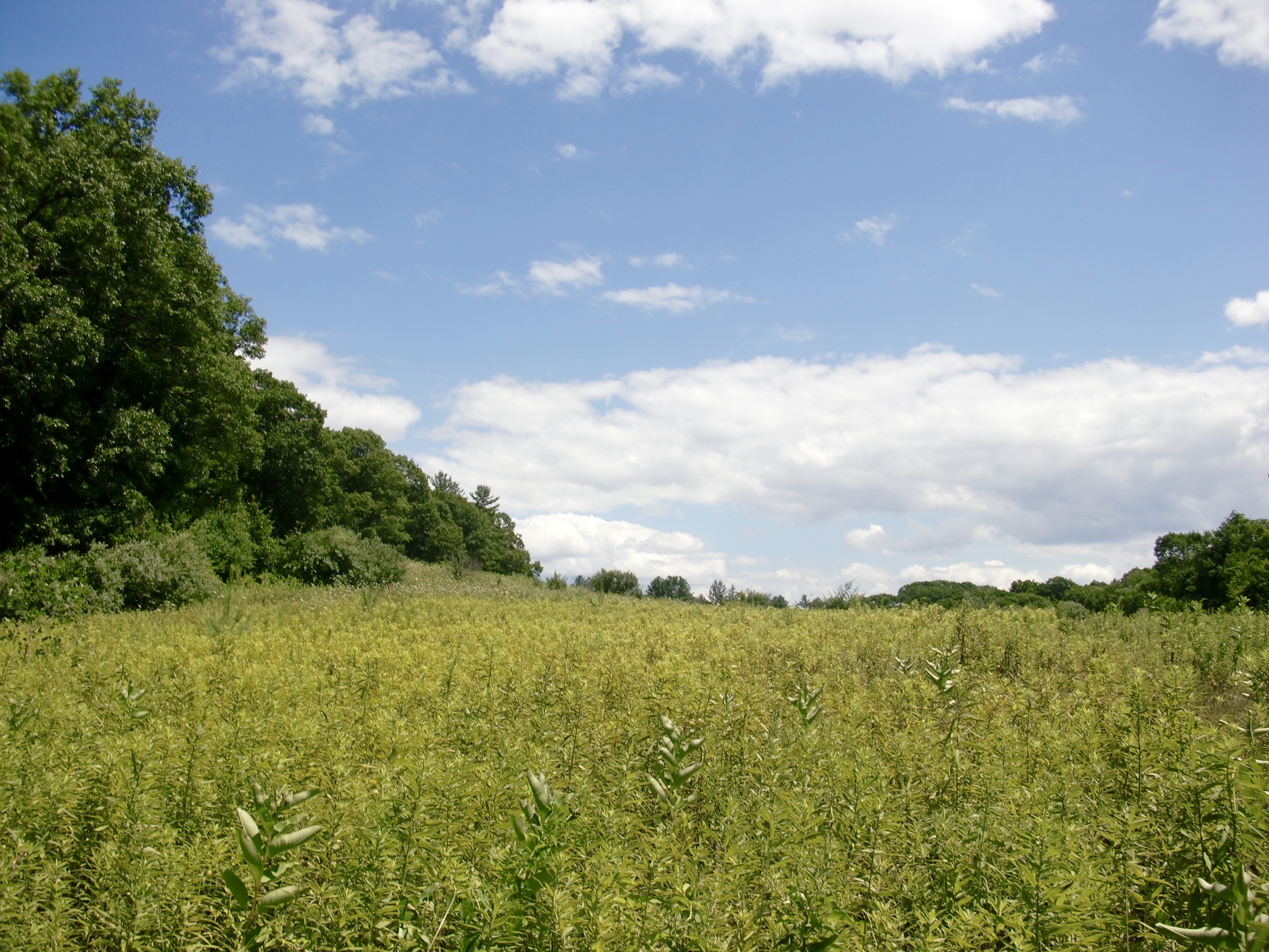 If we spot something new next week, I’ll be sure to photograph it and, if possible, identify it for you (and for myself). In the meantime, here’s the meadow, with common milkweed (Asclepias syriaca) poking up here and there.
