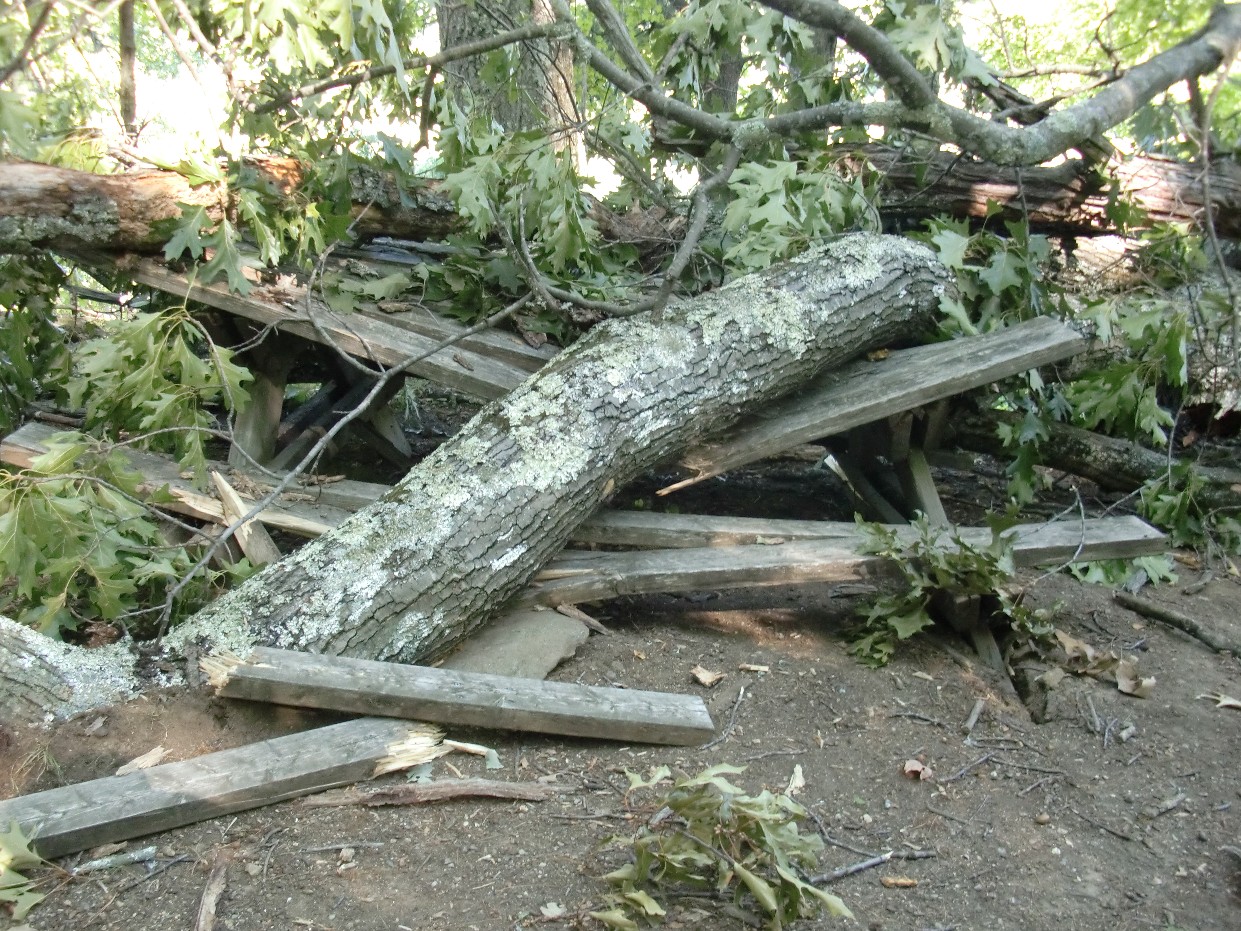 This used to be the picnic table with a view down to the river, but thanks to this weekend’s high winds that didn’t turn into a rainstorm, it’s now kindling under a large, formerly vertical oak tree. We were amazed at how far the tree had dug into the dirt with the force of its fall (you can kind of see that to the bottom left of the photo).