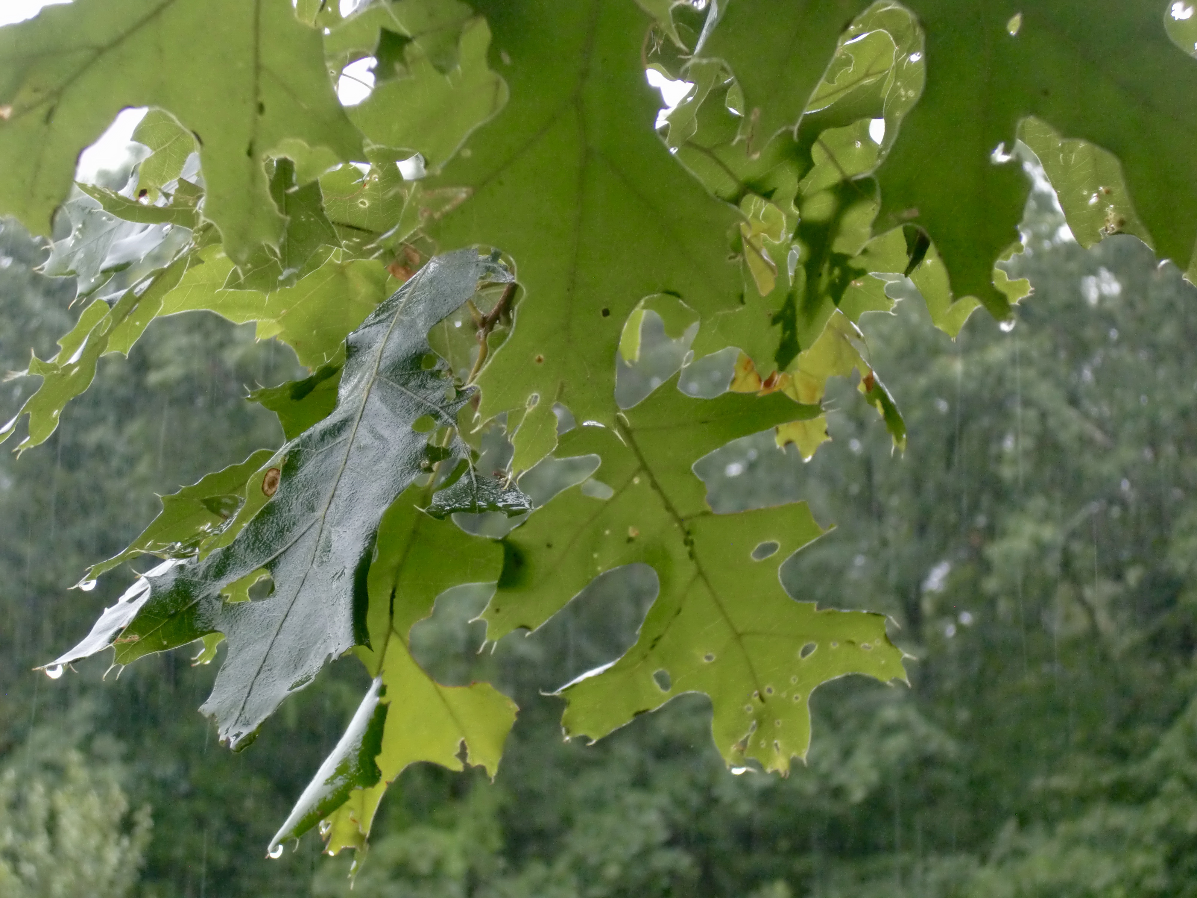 We saw a toad, but it jumped into a patch of poison ivy before we had a chance to photograph (or catch) it. Wet leaves aren’t quite so jumpy: