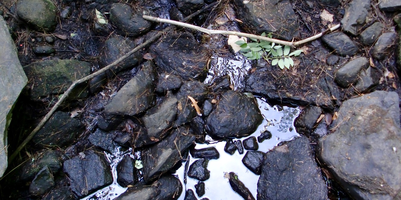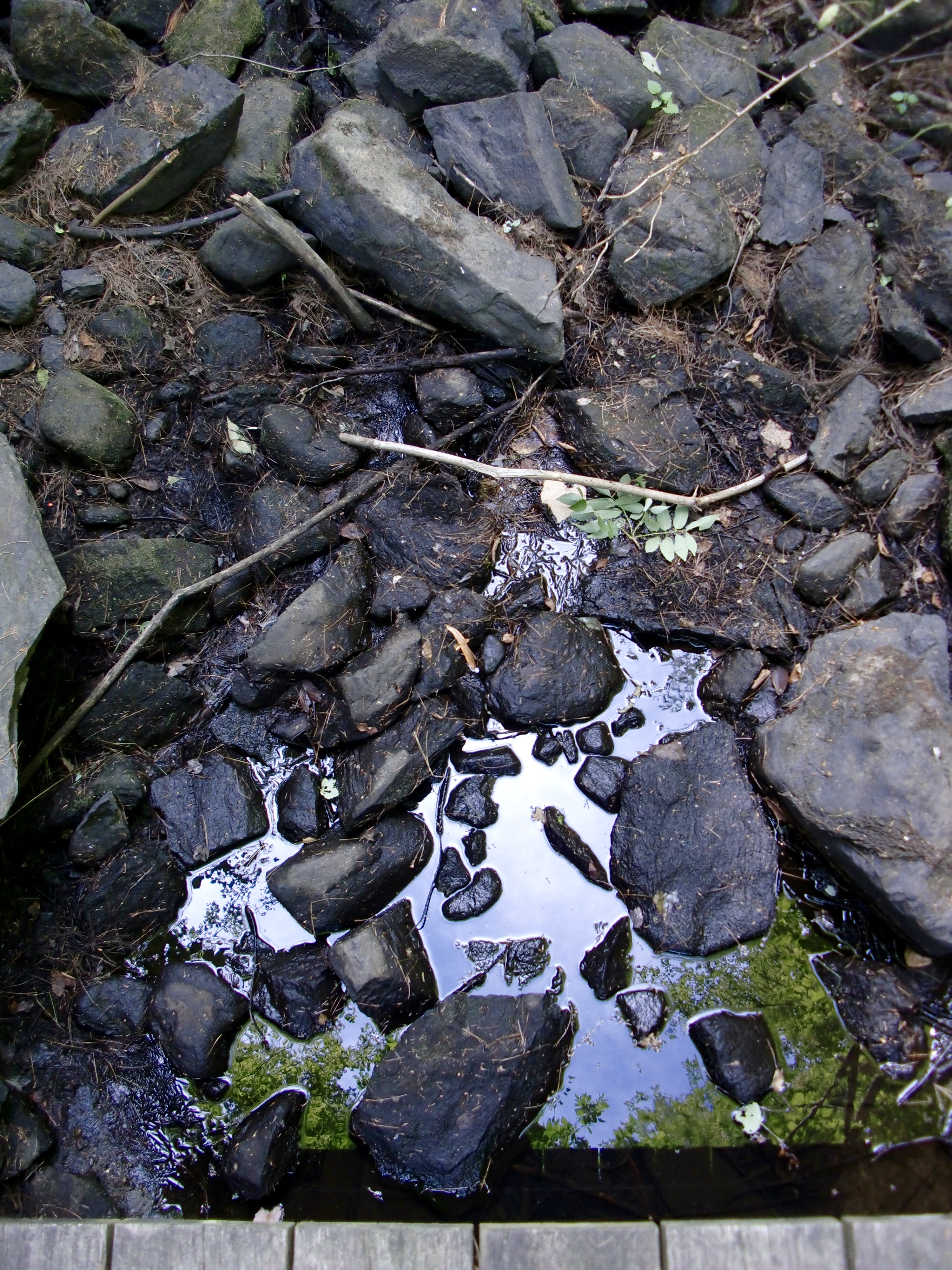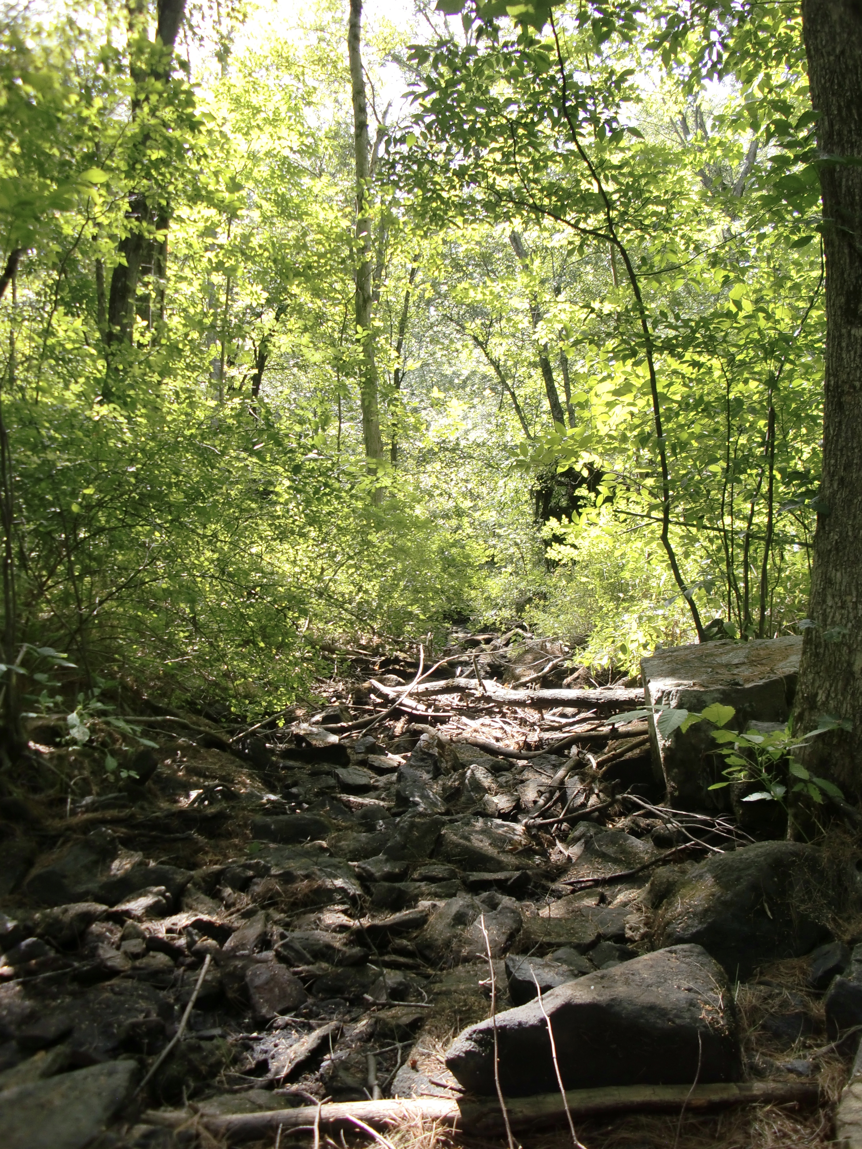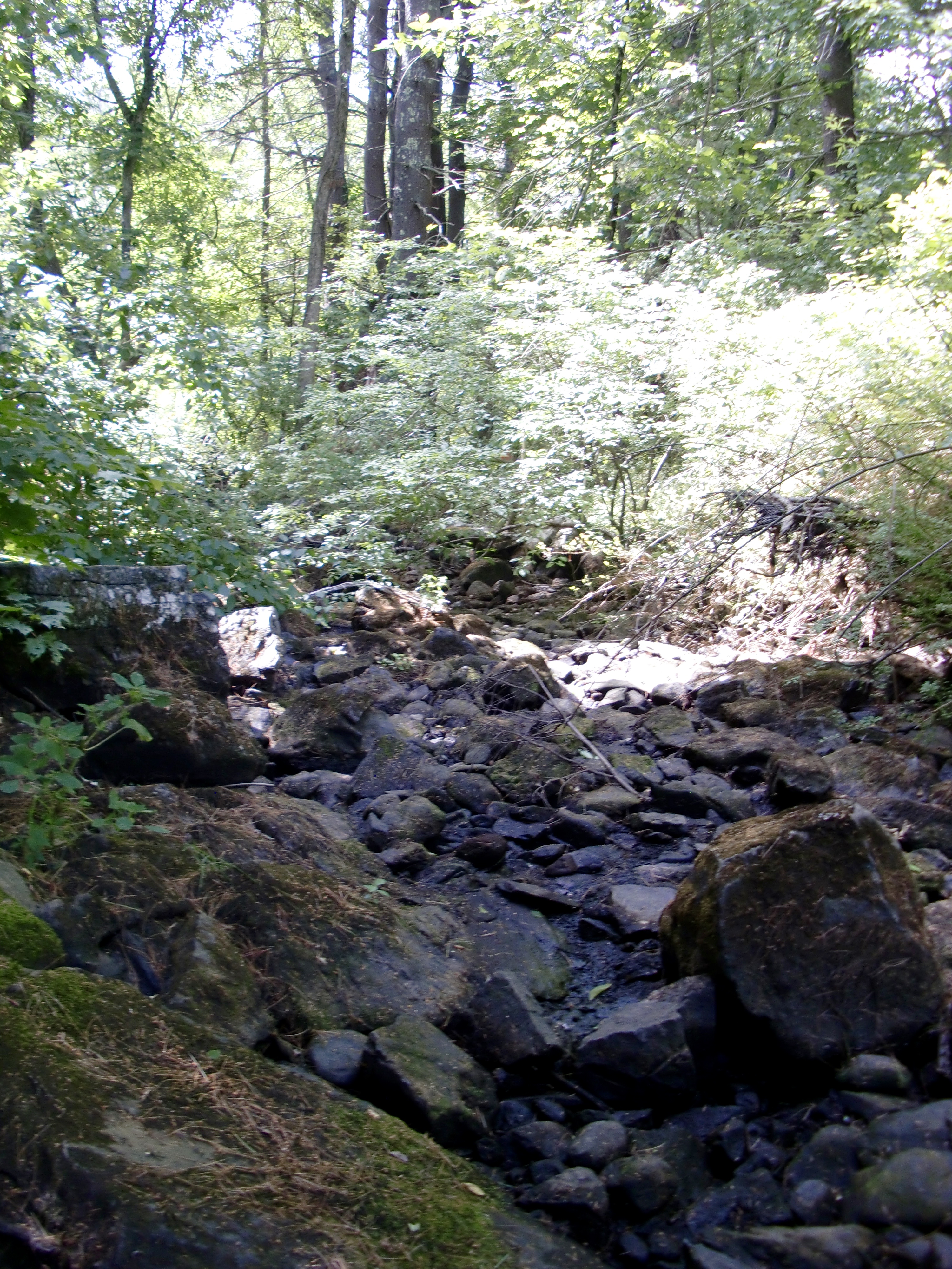 Green frogs (Lithobates clamitans), which we identified by their banjo-sounding croaks, sought refuge in the couple of puddles that remained. They dove beneath half-submerged rocks at the clumsy approach of my hiking boots before I was able to photograph them.