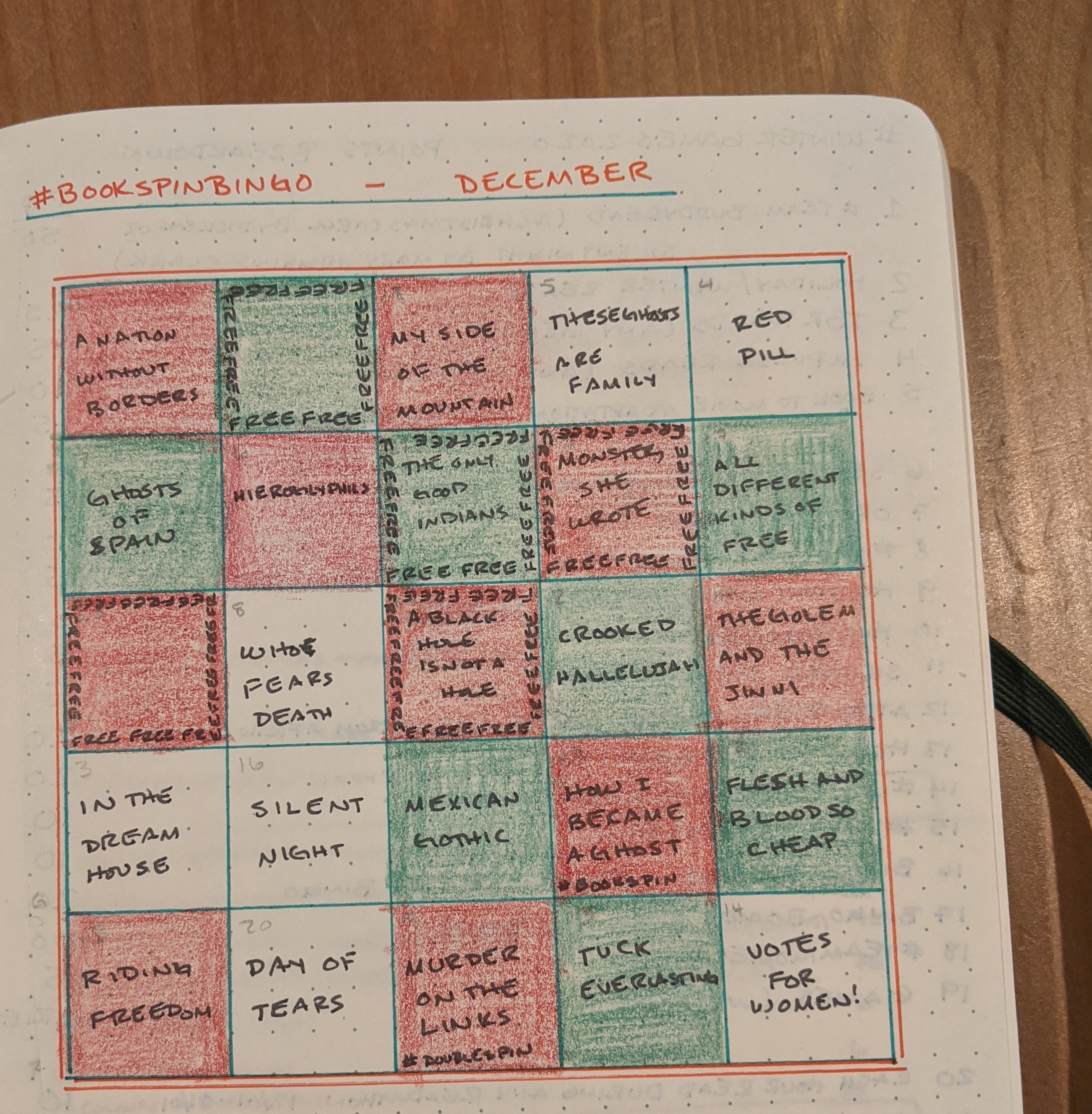 For December, I had an unspoken goal of achieving a blackout on my #bookspinbingo card. I did well, but was still a few titles short (seven, not counting the free spaces).