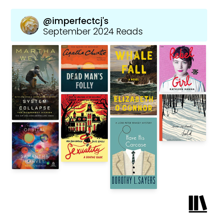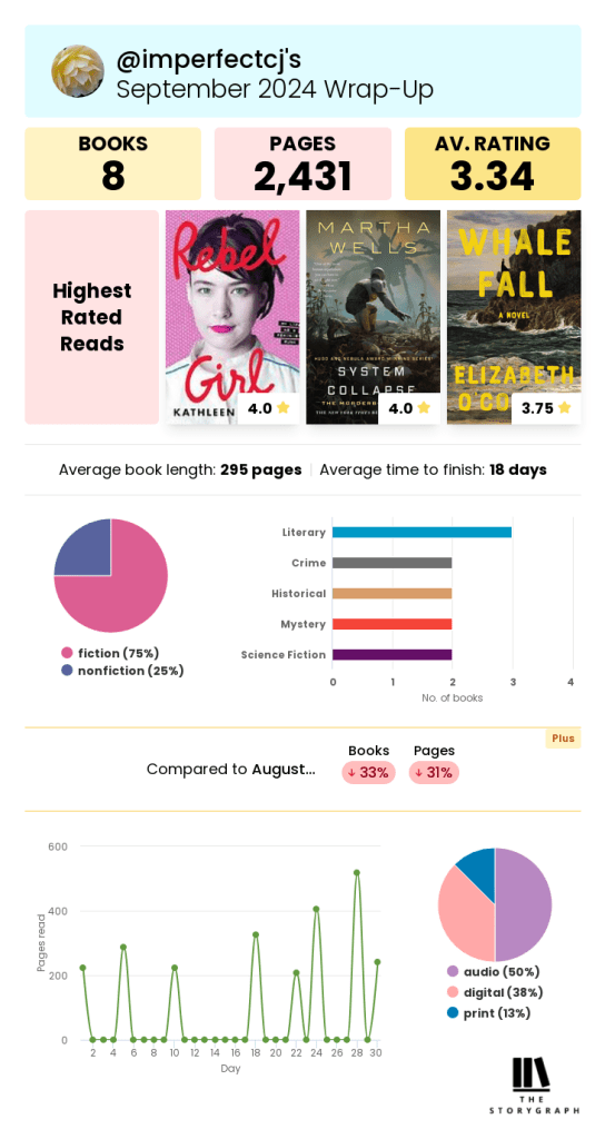 In addition to my StoryGraph, you can see my Litsy profile for status updates throughout the month and my Instagram (@ImperfectHappiness) for mostly not-book-related photos.