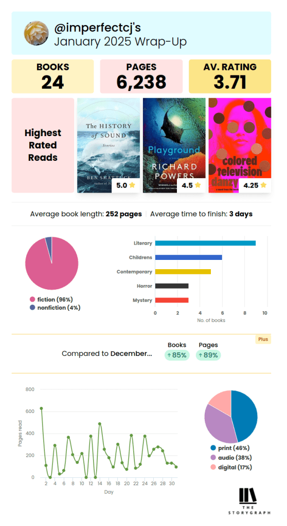 January was about 30 years long and February seems to be the equivalent of a long weekend, so I’m just getting to my first Bookends post of 2025 more than halfway through the month. I do have some fun updates from February to share when I post this month’s books, but for now, here’s what I read in January! (Spoiler: January was an excellent reading month! So many great titles from the Tournament of Books Longlist (and shortlist)!)